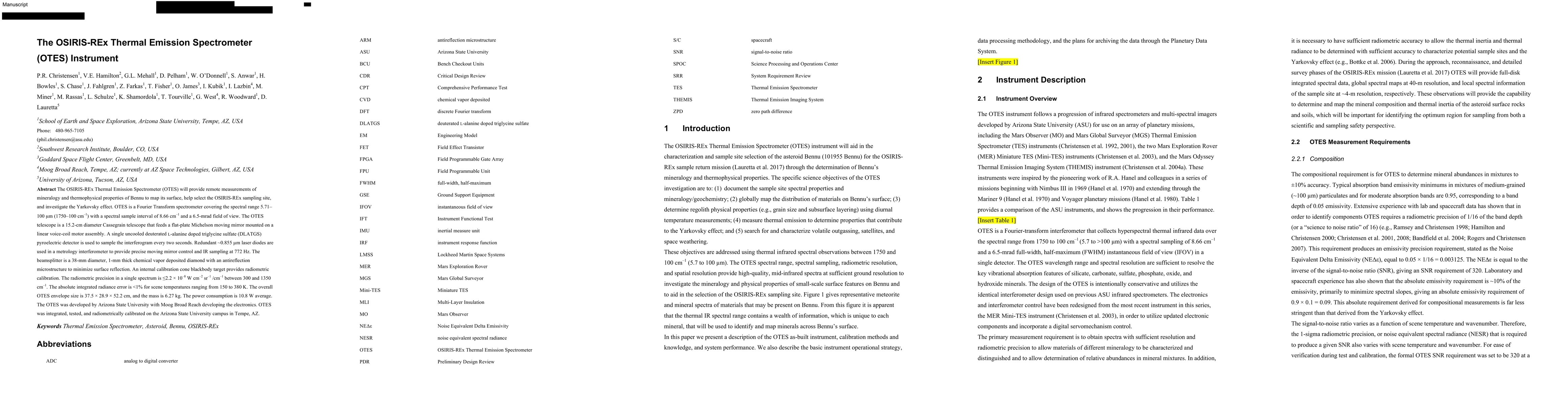 The OSIRIS-REx Thermal Emission Spectrometer (OTES) will provide remote measurements of mineralogy and thermophysical properties of Bennu to map its surface, help select the OSIRIS-REx sampling site, and investigate the Yarkovsky effect. OTES is a Fourier transform spectrometer covering the spectral range 5.71 - 100 {\mu}m (1750 - 100 cm-1) with a spectral sample interval of 8.66 cm-1 and a 6.5-mrad field of view. The OTES telescope is a 15.2-cm diameter Cassegrain telescope that feeds a flat-plate Michelson moving mirror mounted on a linear voice-coil motor assembly. A single uncooled deuterated L-alanine doped triglycine sulfate (DLATGS) pyroelectric detector is used to sample the interferogram every two seconds. Redundant ~0.855 {\mu}m laser diodes are used in a metrology interferometer to provide precise moving mirror control and IR sampling at 772 Hz. The beamsplitter is a 38-mm diameter, 1-mm thick chemical vapor deposited diamond with an antireflection microstructure to minimize surface reflection. An internal calibration cone blackbody target provides radiometric calibration. The radiometric precision in a single spectrum is <= 2.2 x 10-8 W cm-2 sr-1/cm-1 between 300 and 1350 cm-1. The absolute integrated radiance error is <1% for scene temperatures ranging from 150 to 380 K. The overall OTES envelope size is 37.5 x 28.9 x 52.2 cm, and the mass is 6.27 kg. The power consumption is 10.8 W average. The OTES was developed by Arizona State University with Moog Broad Reach developing the electronics. OTES was integrated, tested, and radiometrically calibrated on the Arizona State University campus in Tempe, AZ.