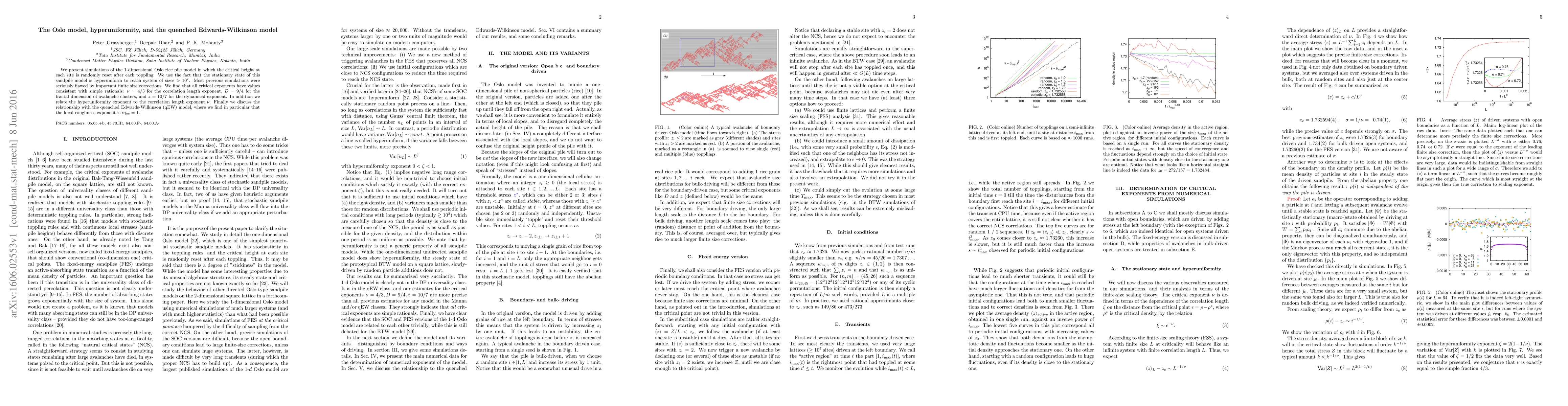 This paper simulates the 1-dimensional Oslo rice pile model, demonstrating hyperuniformity in its stationary state to achieve simulations of sizes greater than $10^7$. The study finds critical exponents consistent with simple rationals and discusses its relation to the quenched Edwards-Wilkinson model, revealing a local roughness exponent of $\alpha_{\rm loc} = 1$.