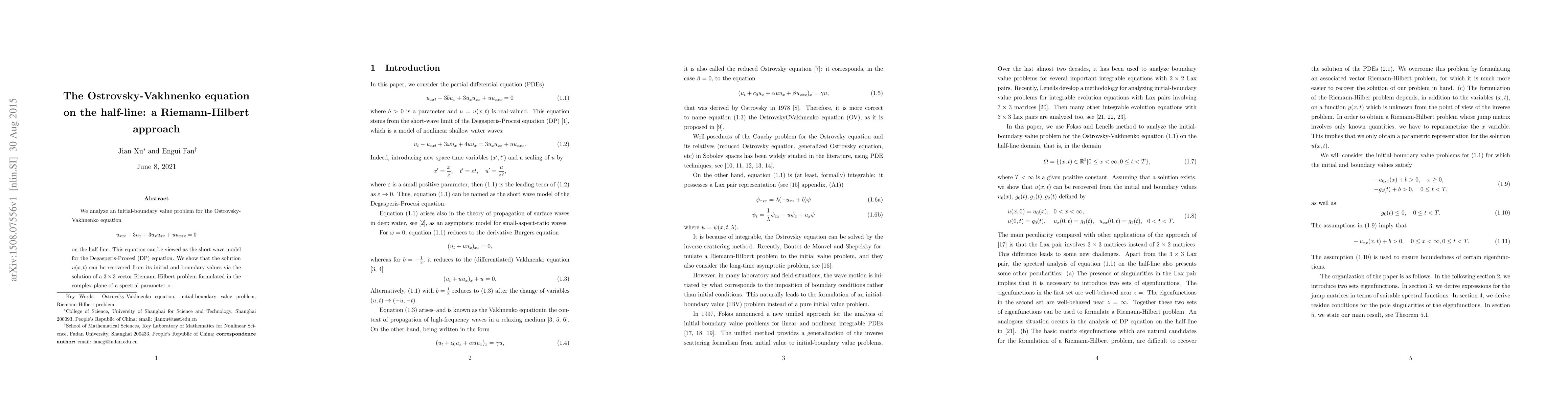 Summary: This paper presents an analysis of an initial-boundary value problem for the Ostrovsky-Vakhnenko equation on the half-line, using a Riemann-Hilbert approach to recover the solution u(x,t) from its initial and boundary values through a 3×3 vector Riemann-Hilbert problem in the complex plane.