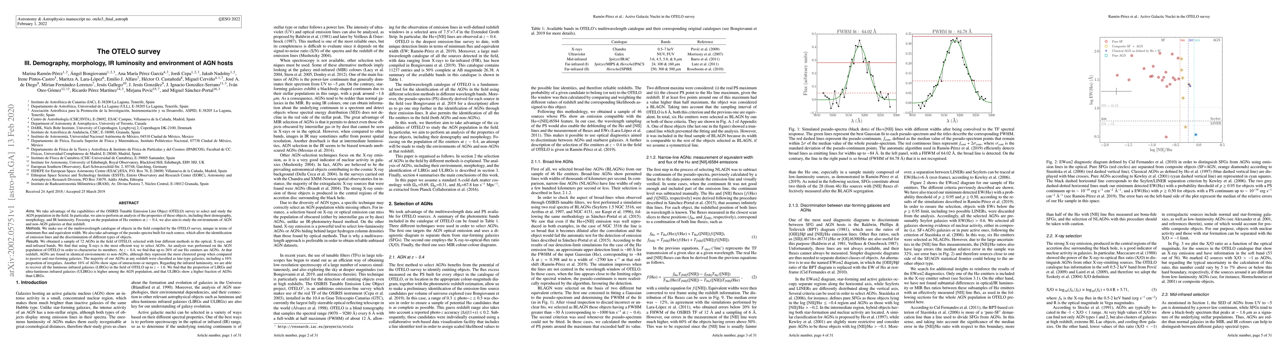 We take advantage of the capabilities of the OTELO survey to select and study the AGN population in the field. We performed an analysis of the properties of these objects, including their demography, morphology, and IR luminosity. Focusing on the population of H$\alpha$ emitters at $z \sim 0.4$, we also aim to study the environments of AGN and non-AGN galaxies at that redshift. We make use of the multiwavelength catalog of objects in the field compiled by the OTELO survey, unique in terms of minimum line flux and equivalent width. The OTELO pseudo-spectra allow the identification of emission lines and the spectral classification of the sources. We obtained a sample of 72 AGNs in the field of OTELO, selected with four different methods in the optical, X-rays, and mid-infrared bands. We find that using X-rays is the most efficient way to select AGNs. An analysis was performed on the AGN population of OTELO in order to characterize its members. At $z \sim 0.4$, we find that up to 26\% of our H$\alpha$ emitters are AGNs. At that redshift, AGNs are found in identical environments to non-AGNs, although they represent the most clustered group when compared to passive and star-forming galaxies. The majority of our AGNs at any redshift were classified as late-type galaxies, including a 16\% proportion of irregulars. Another 16\% of AGNs show signs of interactions or mergers. Regarding the infrared luminosity, we are able to recover all the luminous infrared galaxies (LIRGs) in the field of OTELO up to $z\sim 1.6$. We find that the proportion of LIRGs and ultra-luminous infrared galaxies (ULIRGs) is higher among the AGN population, and that ULIRGs show a higher fraction of AGNs than LIRGs.
