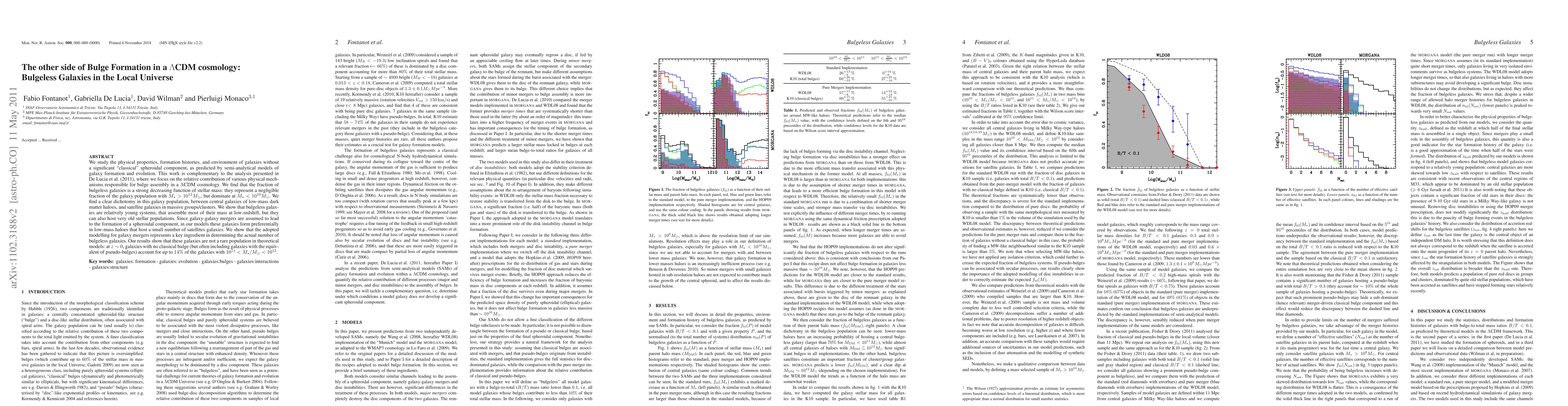 We study the physical properties, formation histories, and environment of galaxies without a significant "classical" spheroidal component, as predicted by semi-analytical models of galaxy formation and evolution. This work is complementary to the analysis presented in De Lucia et al., (2011), where we focus on the relative contribution of various physical mechanisms responsible for bulge assembly in a Lambda-CDM cosmology. We find that the fraction of bulgeless galaxies is a strong decreasing function of stellar mass: they represent a negligible fraction of the galaxy population with M* > 10^12 Msun, but dominate at M* < 10^10 Msun. We find a clear dichotomy in this galaxy population, between central galaxies of low-mass dark matter haloes, and satellite galaxies in massive groups/clusters. We show that bulgeless galaxies are relatively young systems, that assemble most of their mass at low-redshift, but they can also host very old stellar populations. Since galaxy-galaxy mergers are assumed to lead to the formation of a spheroidal component, in our models these galaxies form preferentially in low-mass haloes that host a small number of satellites galaxies. We show that the adopted modelling for galaxy mergers represents a key ingredient in determining the actual number of bulgeless galaxies. Our results show that these galaxies are not a rare population in theoretical models: at z~0, galaxies with no classical bulge (but often including galaxies with the equivalent of pseudo-bulges) account for up to 14% of the galaxies with 10^11 < M*/Msun < 10^12.