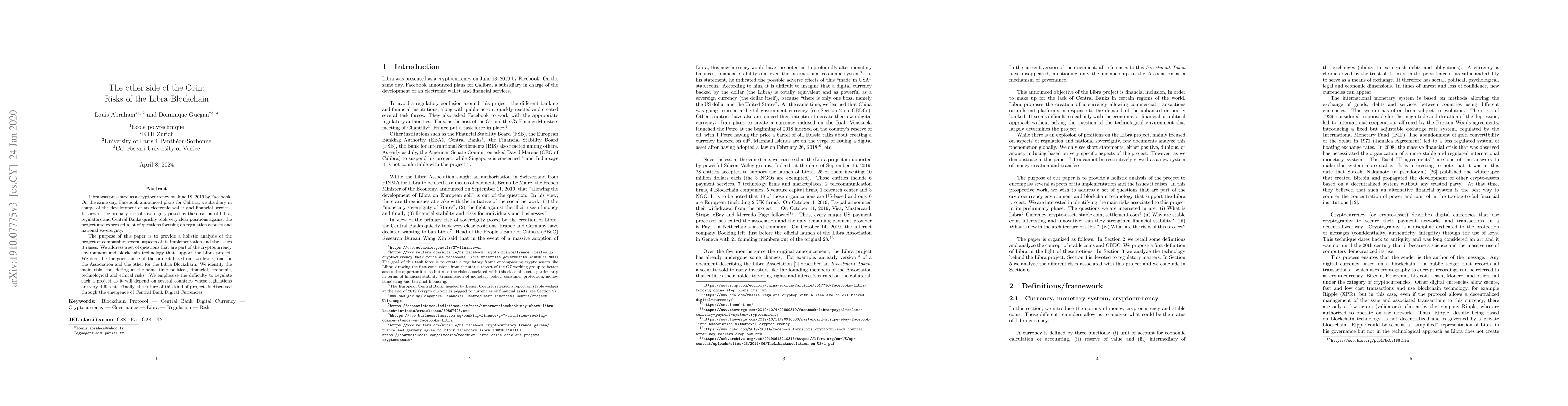 Libra was presented as a cryptocurrency on June 18, 2019 by Facebook. On the same day, Facebook announced plans for Calibra, a subsidiary in charge of the development of an electronic wallet and financial services. In view of the primary risk of sovereignty posed by the creation of Libra, regulators and Central Banks quickly took very clear positions against the project and expressed a lot of questions focusing on regulation aspects and national sovereignty. The purpose of this paper is to provide a holistic analysis of the project encompassing several aspects of its implementation and the issues it raises. We address a set of questions that are part of the cryptocurrency environment and blockchain technology that support the Libra project. We describe the governance of the project based on two levels, one for the Association and the other for the Libra Blockchain. We identify the main risks considering at the same time political, financial, economic, technological and ethical risks. We emphasize the difficulty to regulate such a project as it will depend on several countries whose legislations are very different. Finally, the future of this kind of projects is discussed through the emergence of Central Bank Digital Currencies.