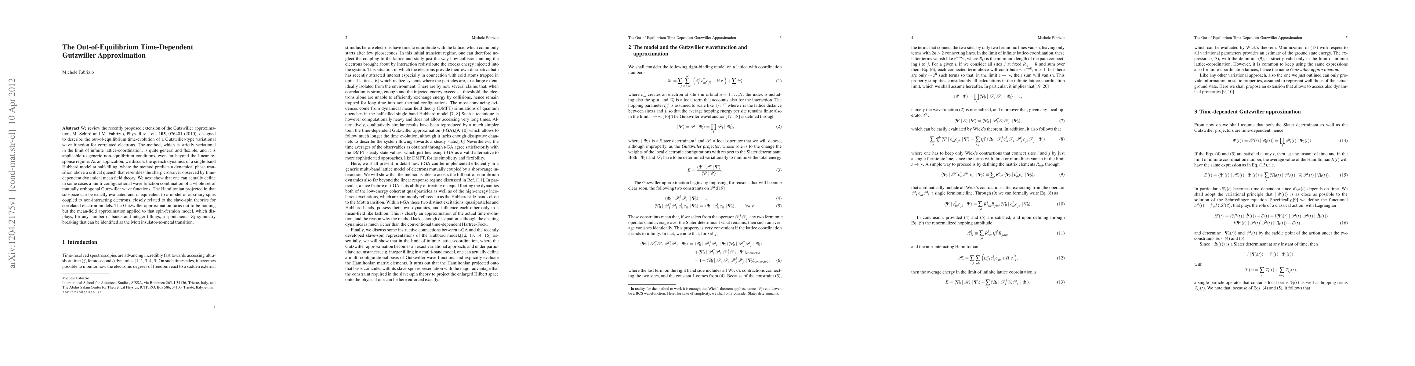 We review the recently proposed extension of the Gutzwiller approximation, M. Schiro' and M. Fabrizio, Phys. Rev. Lett. 105, 076401 (2010), designed to describe the out-of-equilibrium time-evolution of a Gutzwiller-type variational wave function for correlated electrons. The method, which is strictly variational in the limit of infinite lattice-coordination, is quite general and flexible, and it is applicable to generic non-equilibrium conditions, even far beyond the linear response regime. As an application, we discuss the quench dynamics of a single-band Hubbard model at half-filling, where the method predicts a dynamical phase transition above a critical quench that resembles the sharp crossover observed by time-dependent dynamical mean field theory. We next show that one can actually define in some cases a multi-configurational wave function combination of a whole set of mutually orthogonal Gutzwiller wave functions. The Hamiltonian projected in that subspace can be exactly evaluated and is equivalent to a model of auxiliary spins coupled to non-interacting electrons, closely related to the slave-spin theories for correlated electron models. The Gutzwiller approximation turns out to be nothing but the mean-field approximation applied to that spin-fermion model, which displays, for any number of bands and integer fillings, a spontaneous $Z_2$ symmetry breaking that can be identified as the Mott insulator-to-metal transition.