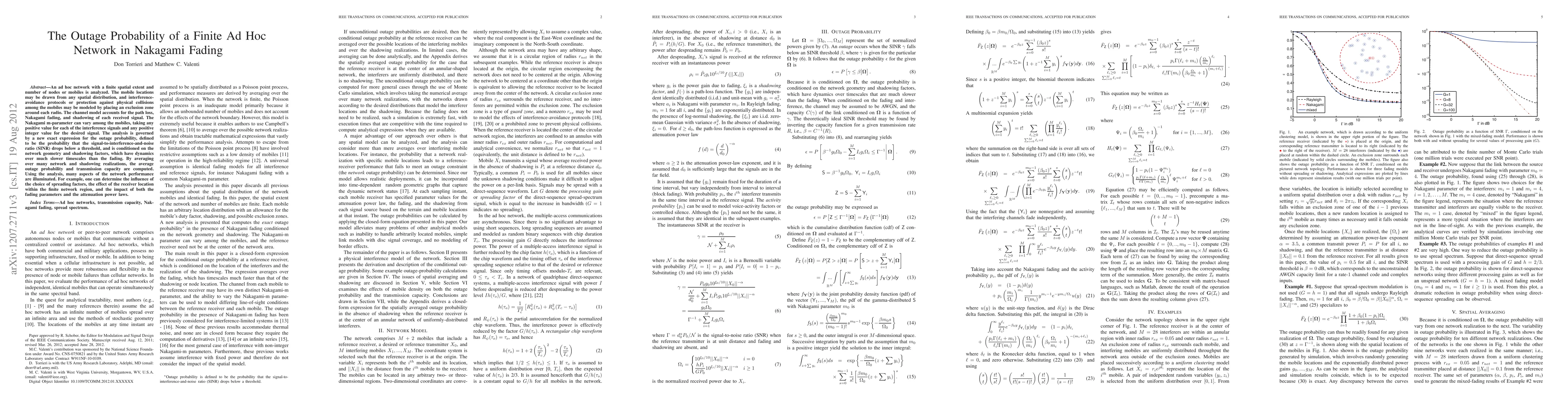This paper analyzes the outage probability in a finite ad hoc network with Nakagami fading, deriving an exact expression for the probability that the signal-to-interference-and-noise ratio falls below a threshold. The study examines the impact of network geometry, shadowing, and fading parameters on the network's performance, revealing insights into transmission capacity and the influence of various factors.
