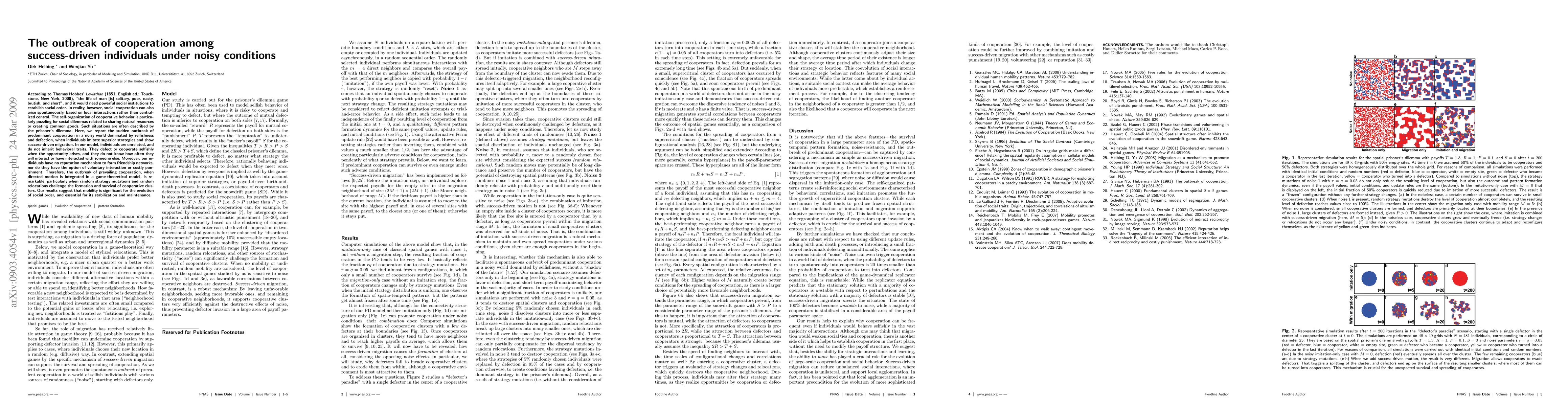 This paper explores how cooperation can spontaneously emerge among self-interested individuals in a noisy environment, even without centralized control or reputation systems. The study finds that success-driven migration and imitation of superior strategies lead to the unexpected outbreak of cooperation, highlighting the importance of mobility in the evolution and stabilization of social order.