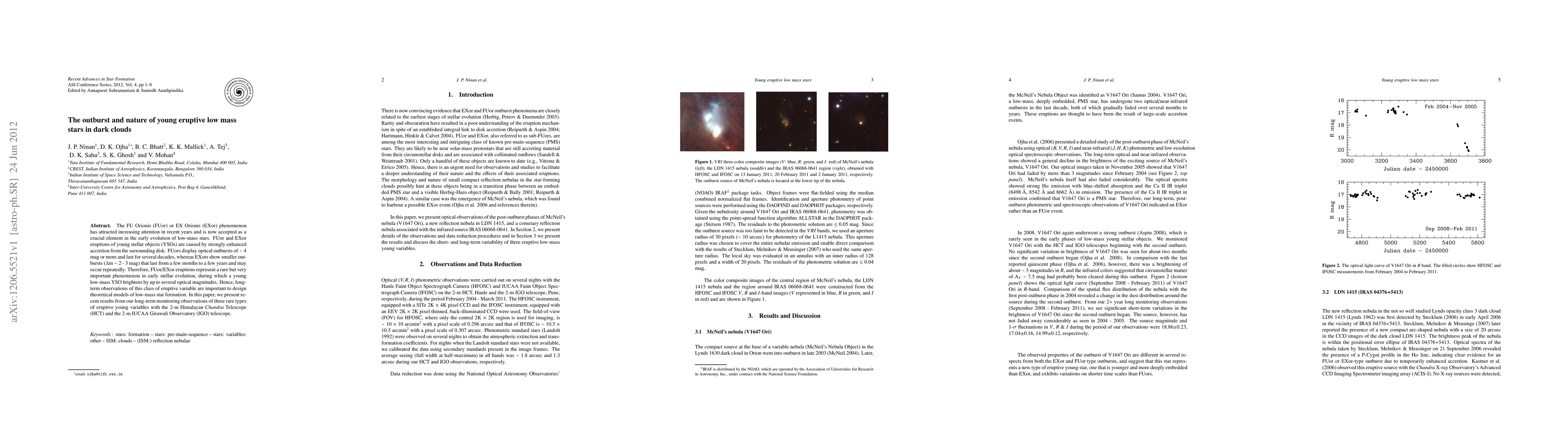This paper investigates the outbursts of young eruptive low-mass stars (FUor and EXor phenomena) in dark clouds, revealing their nature and importance in early stellar evolution through long-term monitoring with the Himalayan Chandra Telescope and the IUCAA Girawali Observatory telescope. These eruptions, characterized by significant optical brightening, provide crucial insights for theoretical models of star formation.