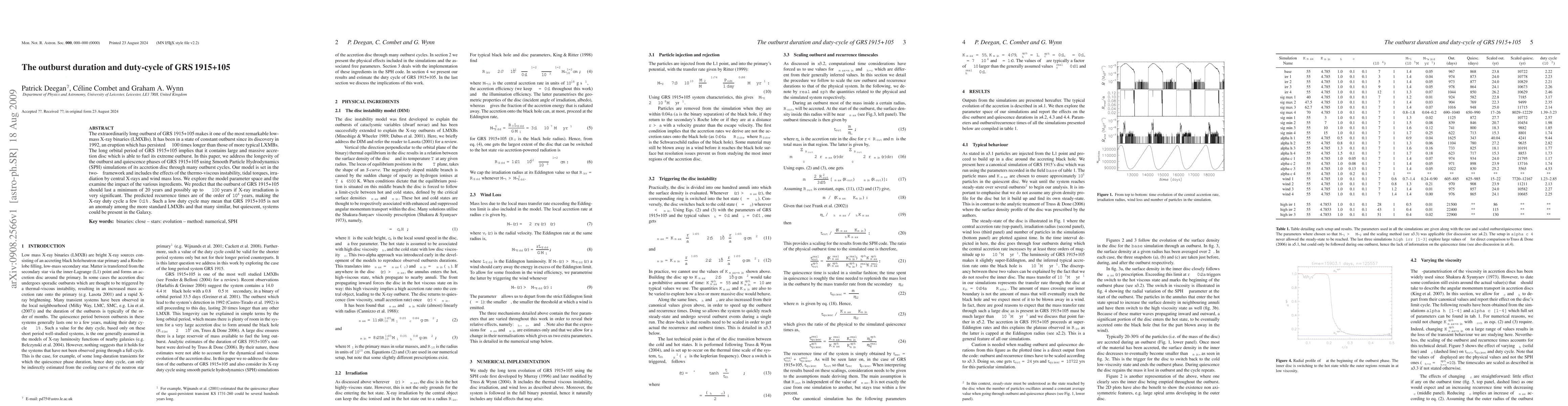 This paper investigates the prolonged outburst and quiescence phases of the low-mass X-ray binary GRS 1915+105 using SPH simulations, predicting its outburst duration to last between 20 to 100 years and a recurrence time of around 10^4 years, suggesting a low X-ray duty cycle of ~0.1%.