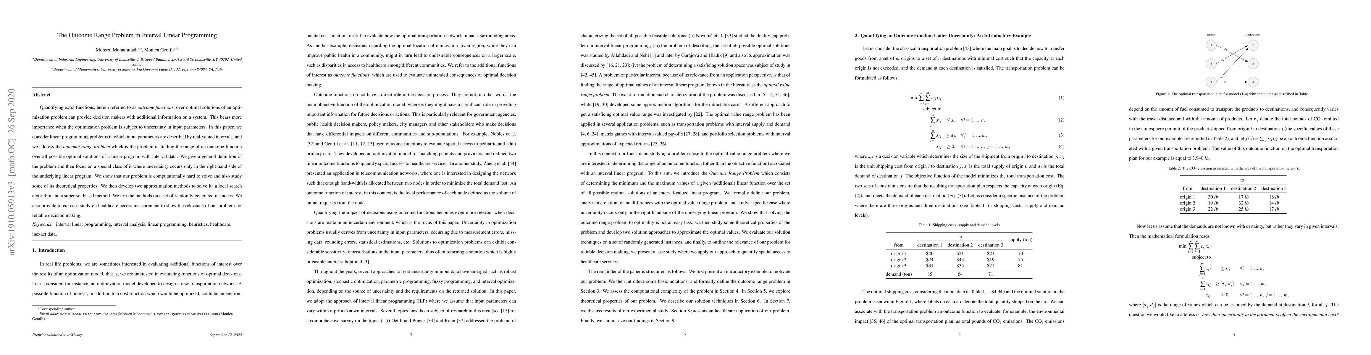 Quantifying extra functions, herein referred to as outcome functions, over optimal solutions of an optimization problem can provide decision makers with additional information on a system. This bears more importance when the optimization problem is subject to uncertainty in input parameters. In this paper, we consider linear programming problems in which input parameters are described by real-valued intervals, and we address the outcome range problem which is the problem of finding the range of an outcome function over all possible optimal solutions of a linear program with interval data. We give a general definition of the problem and then focus on a special class of it where uncertainty occurs only in the right-hand side of the underlying linear program. We show that our problem is computationally hard to solve and also study some of its theoretical properties. We then develop two approximation methods to solve it: a local search algorithm and a super-set based method. We test the methods on a set of randomly generated instances. We also provide a real case study on healthcare access measurement to show the relevance of our problem for reliable decision making.