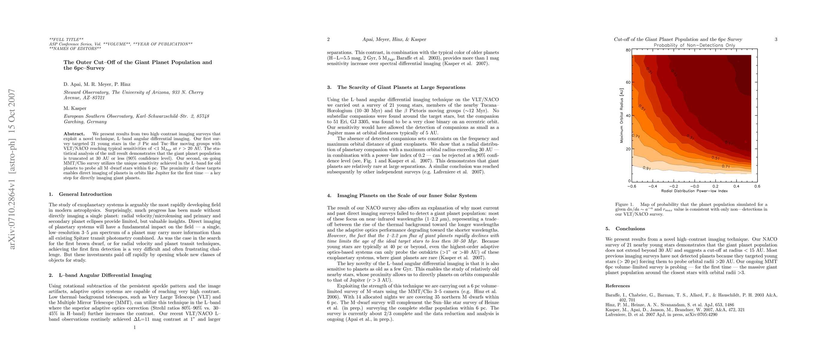 We present results from two high-contrast imaging surveys that exploit a novel technique, L-band angular differential imaging. Our first survey targeted 21 young stars in the Beta Pic and Tuc-Hor moving groups with VLT/NACO reaching typical sensitivities of <1 MJup at r > 20 AU. The statistical analysis of the null result demonstrates that the giant planet population is truncated at 30 AU or less (90% confidence level). Our second, on-going MMT/Clio survey utilizes the unique sensitivity achieved in the L-band for old planets to probe all M-dwarf stars within 6 pc. The proximity of these targets enables direct imaging of planets in orbits like Jupiter for the first time - a key step for directly imaging giant planets.