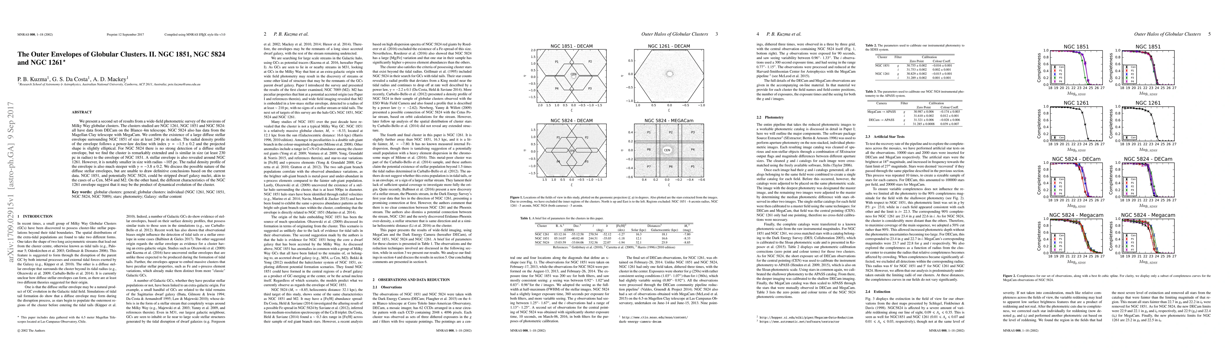 This paper investigates the diffuse stellar envelopes surrounding three globular clusters: NGC 1851, NGC 5824, and NGC 1261. It confirms a large envelope around NGC 1851, while NGC 5824 and NGC 1261 have smaller envelopes, suggesting different formation processes for each cluster.