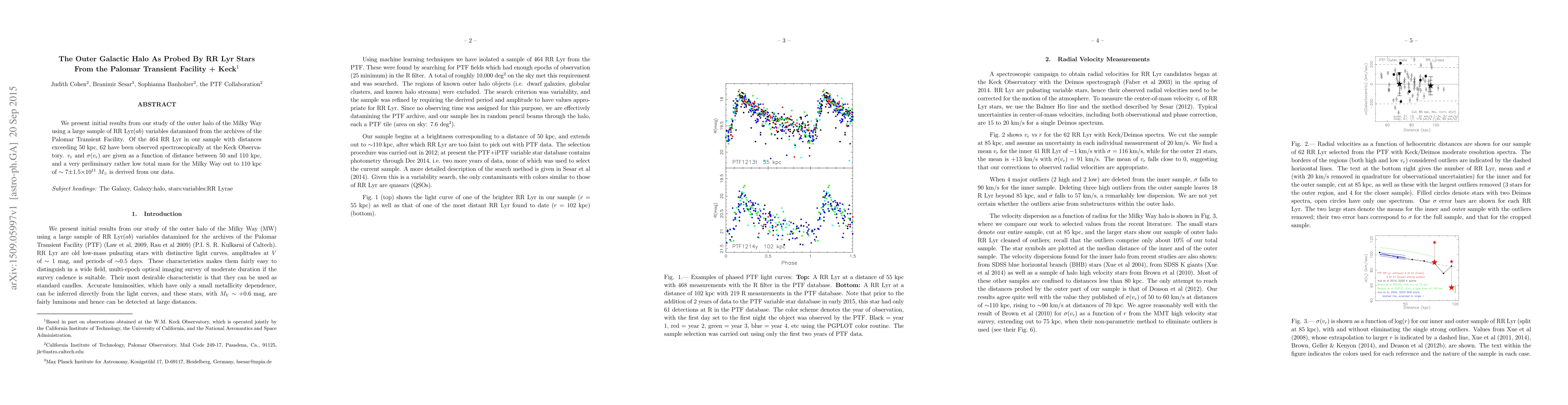 We present initial results from our study of the outer halo of the Milky Way using a large sample of RR Lyr(ab) variables datamined from the archives of the Palomar Transient Facility. Of the 464 RR Lyr in our sample with distances exceeding 50 kpc, 62 have been observed spectroscopically at the Keck Observatory. Radial velocities and sigma(vr) are given as a function of distance between 50 and 110 kpc, and a very preliminary rather low total mass for the Milky Way out to 110 kpc of ~7 (+-1.5) x 10**11 solar masses is derived from our data.