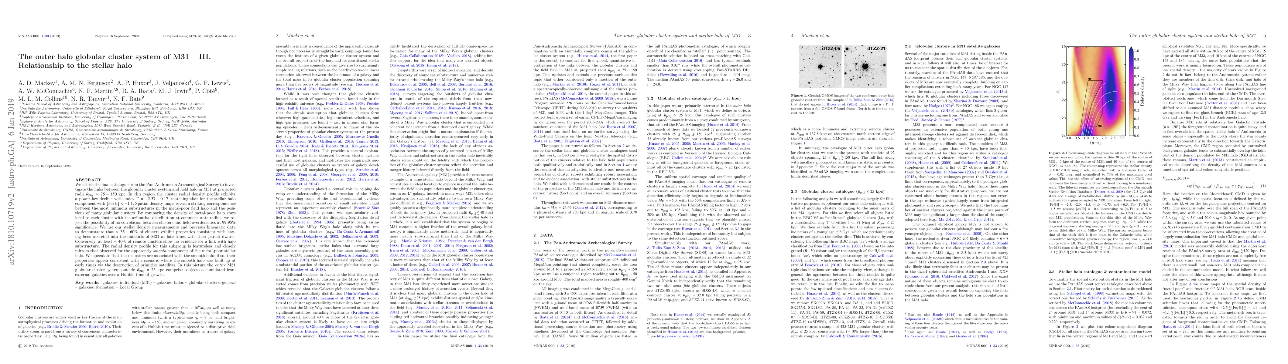 We utilise the final catalogue from the Pan-Andromeda Archaeological Survey to investigate the links between the globular cluster system and field halo in M31 at projected radii $R_p=25-150$ kpc. In this region the cluster radial density profile exhibits a power-law decline with index $\Gamma=-2.37\pm0.17$, matching that for the stellar halo component with [Fe/H] $<-1.1$. Spatial density maps reveal a striking correspondence between the most luminous substructures in the metal-poor field halo and the positions of many globular clusters. By comparing the density of metal-poor halo stars local to each cluster with the azimuthal distribution at commensurate radius, we reject the possibility of no correlation between clusters and field overdensities with high confidence. We use our stellar density measurements and previous kinematic data to demonstrate that $\approx35-60\%$ of clusters exhibit properties consistent with having been accreted into the outskirts of M31 at late times with their parent dwarfs. Conversely, at least $\sim40\%$ of remote clusters show no evidence for a link with halo substructure. The radial density profile for this subgroup is featureless and closely mirrors that observed for the apparently smooth component of the metal-poor stellar halo. We speculate that these clusters are associated with the smooth halo; if so, their properties appear consistent with a scenario where the smooth halo was built up at early times via the destruction of primitive satellites. In this picture the entire M31 globular cluster system outside $R_p=25$ kpc comprises objects accumulated from external galaxies over a Hubble time of growth.