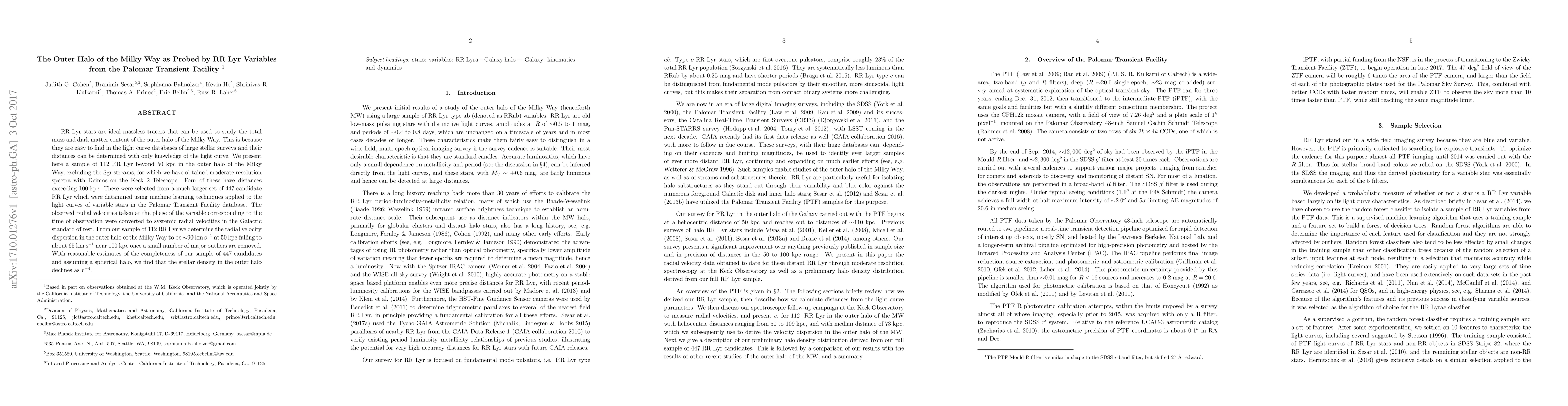 RR Lyr stars are ideal massless tracers that can be used to study the total mass and dark matter content of the outer halo of the Milky Way. This is because they are easy to find in the light curve databases of large stellar surveys and their distances can be determined with only knowledge of the light curve. We present here a sample of 112 RR Lyr beyond 50 kpc in the outer halo of the Milky Way, excluding the Sgr streams, for which we have obtained moderate resolution spectra with Deimos on the Keck 2 Telescope. Four of these have distances exceeding 100 kpc. These were selected from a much larger set of 447 candidate RR Lyr which were datamined using machine learning techniques applied to the light curves of variable stars in the Palomar Transient Facility database. The observed radial velocities taken at the phase of the variable corresponding to the time of observation were converted to systemic radial velocities in the Galactic standard of rest. From our sample of 112 RR Lyr we determine the radial velocity dispersion in the outer halo of the Milky Way to be ~90 km/s at 50 kpc falling to about 65 km/s near 100 kpc once a small number of major outliers are removed. With reasonable estimates of the completeness of our sample of 447 candidates and assuming a spherical halo, we find that the stellar density in the outer halo declines as the -4 power of r.