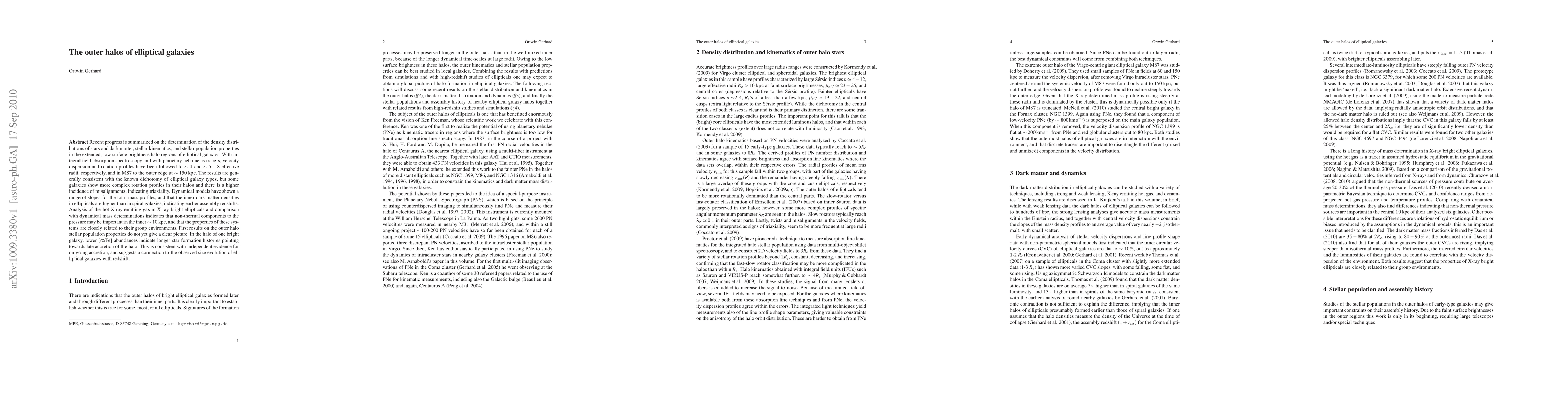 This paper reviews recent findings on the density, kinematics, and stellar populations in the extended halos of elliptical galaxies, revealing complex rotation profiles and misalignments indicative of triaxiality. The study highlights the higher inner dark matter densities in ellipticals compared to spirals, suggesting earlier assembly, and notes the influence of group environments on these systems.