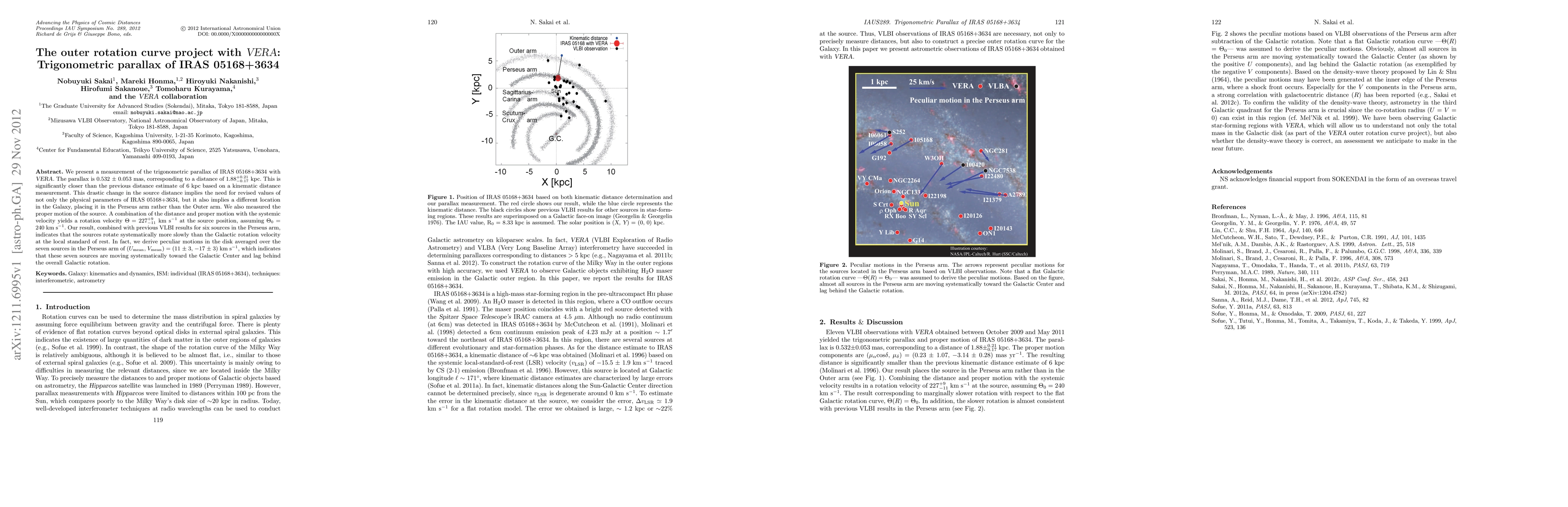 This study uses VERA to measure the trigonometric parallax of IRAS 05168+3634, finding a much closer distance of 1.88 kpc compared to previous estimates, and placing it in the Perseus arm instead of the Outer arm. The derived rotation velocity suggests these sources rotate more slowly than the Galactic average, indicating peculiar motions toward the Galactic Center.