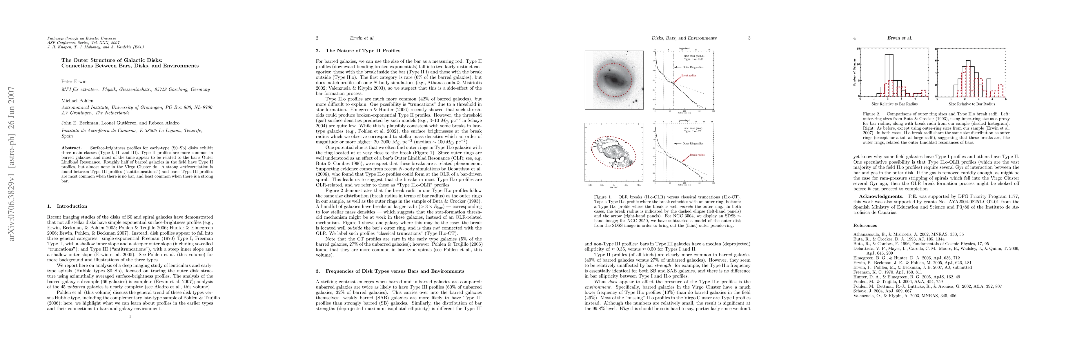 Surface-brightness profiles for early-type (S0-Sb) disks exhibit three main classes (Type I, II, and III). Type II profiles are more common in barred galaxies, and most of the time appear to be related to the bar's Outer Lindblad Resonance. Roughly half of barred galaxies in the field have Type II profiles, but almost none in the Virgo Cluster do; this might be related to ram-pressure stripping in clusters. A strong \textit{anti}correlation is found between Type III profiles ("antitruncations") and bars: Type III profiles are most common when there is no bar, and least common when there is a strong bar.