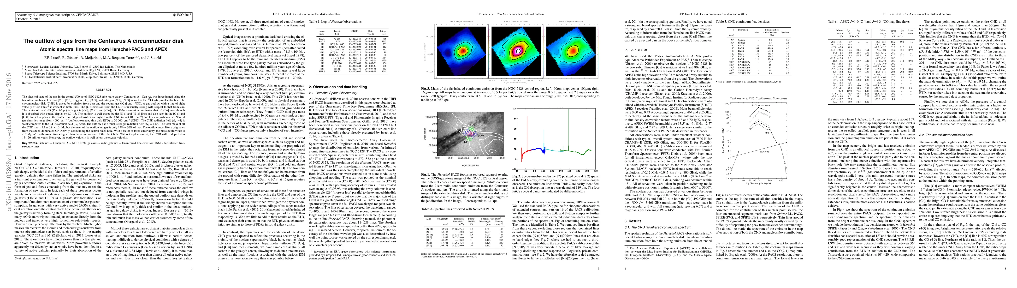 The physical state of the gas in the central 500 pc of NGC~5128 (the radio galaxy Centaurus A - Cen A), was investigated using the far-infrared fine-structure lines of carbon, oxygen, and nitrogen, as well as the CO(4-3) molecular line. The circumnuclear disk (CND) is traced by emission from dust and the neutral gas ([CI] and CO). A gas outflow with a line-of-sight velocity of 60 km/s is evident in both species. The center of the CND is bright in [OI], [OIII], and [CII]; [OI]63mu emission dominates that of [CII] even though it is absorbed with optical depths of 1.0-1.5. The outflow is well-traced by the [NII] and [NIII] lines and also seen in the [CII] and [OIII] lines that peak in the center. Ionized gas densities are moderate in the CND and low everywhere else. Neutral gas densities range from 4000 per cm3 (outflow, extended thin disk ETD) to 20 000 per cm3 (CND). The CND radiation field is weak compared to the ETD starburst field. The outflow has a much stronger radiation field. The total mass of all the CND gas is 9 x 10^(7) M(o) and the mass of the outflowing gas is only 15%-30% of that. The outflow most likely originates from the shock-dominated CND cavity surrounding the central black hole. With a factor of three uncertainty, the mass outflow rate is about 2 M(o)/yr, a thousand times higher than the accretion rate of the black hole. Without replenishment, the CND will be depleted in 15-120 million years. However, the outflow velocity is well below the escape velocity.