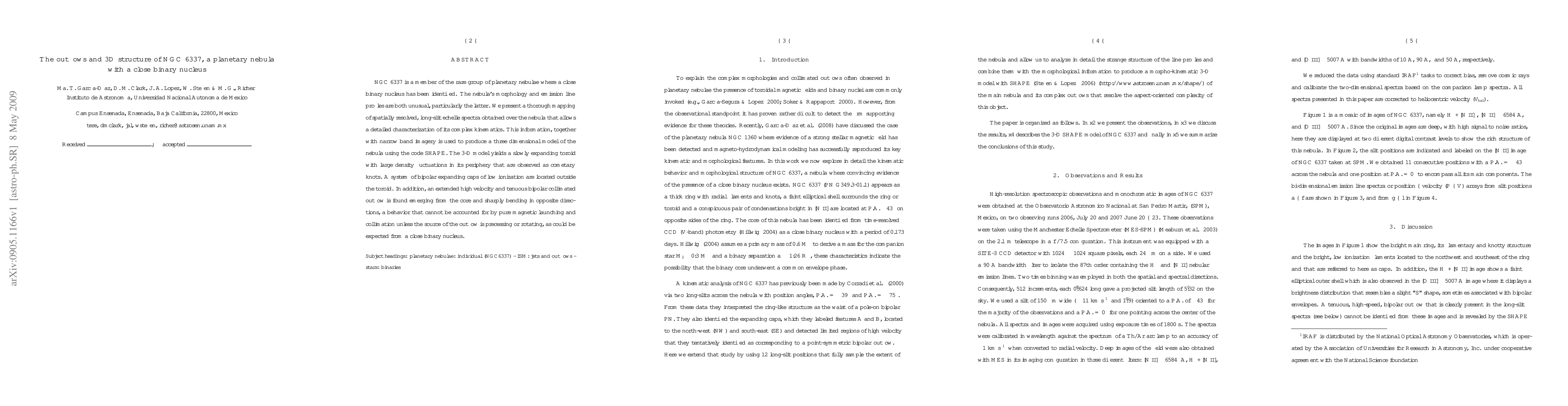 The research details the 3D structure of planetary nebula NGC 6337, which hosts a close binary nucleus. Using spatially resolved spectra and narrow band imagery, a complex kinematic model was created, revealing a slowly expanding toroidal nebula with density fluctuations and cometary knots. Additionally, bipolar, low-ionization caps and high-velocity, collimated outflows emerging from the core in opposite directions were found, suggesting a precessing or rotating source linked to the close binary nucleus.
