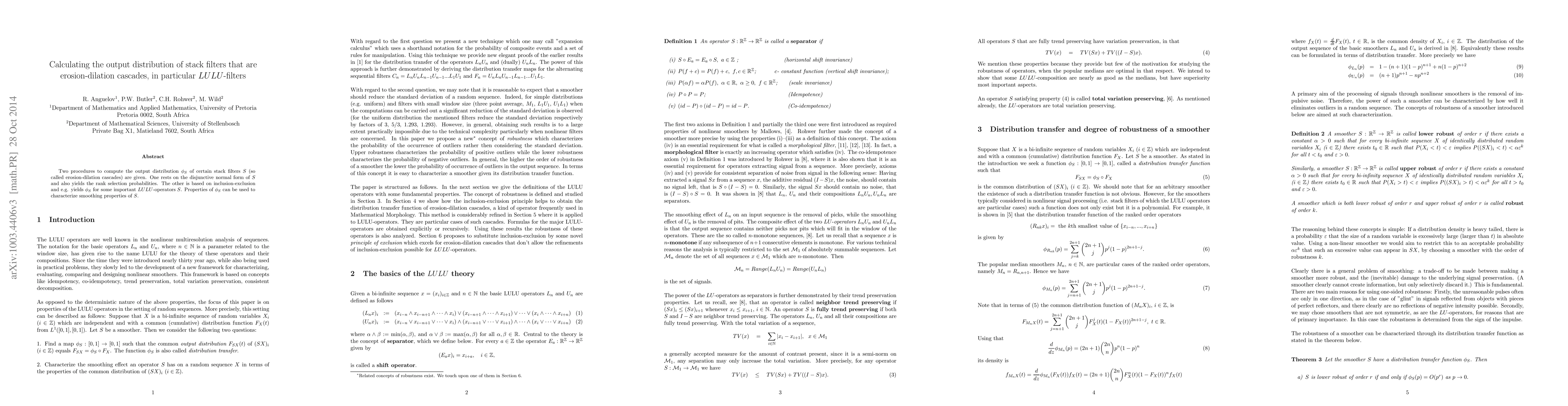 This paper presents two methods to compute the output distribution of stack filters, specifically erosion-dilation cascades, and important LULU-operators. One method uses the disjunctive normal form to yield rank selection probabilities, while the other employs inclusion-exclusion to determine the output distribution, with applications to characterizing smoothing properties and calculating reliability polynomials for Boolean functions.