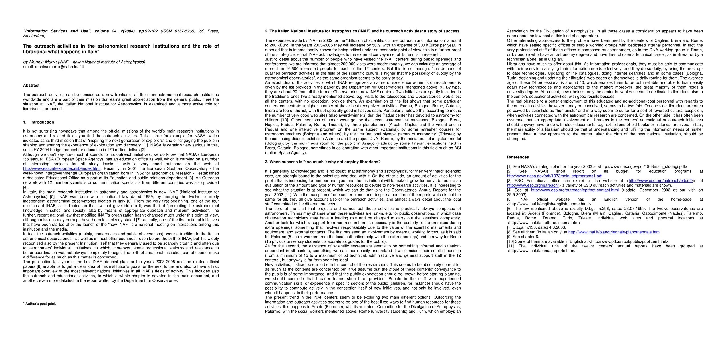 The outreach activities can be considered a new frontier of all the main astronomical research institutions worldwide and are a part of their mission that earns great appreciation from the general public. Here the situation at INAF, the Italian National Institute for Astrophysics, is examined and a more active role for librarians is proposed.