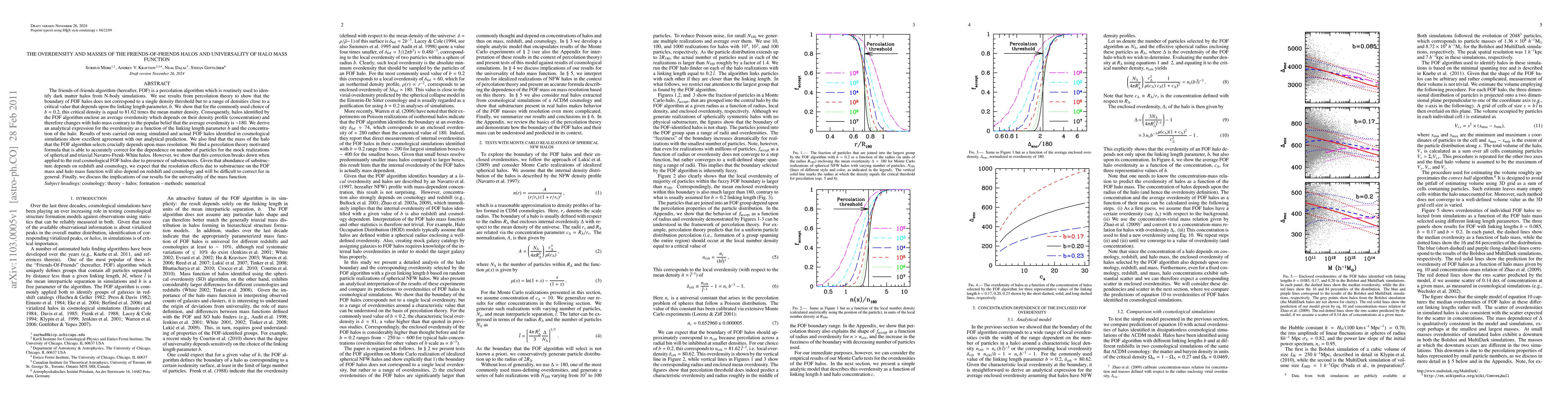 This paper investigates the overdensity and mass of dark matter halos identified by the friends-of-friends algorithm, revealing that the average overdensity varies with halo mass and linking length parameter, contrary to the common assumption of a fixed value. It also highlights the dependence of halo mass on resolution and the challenges of correcting for substructures, which complicates the universality of the halo mass function.