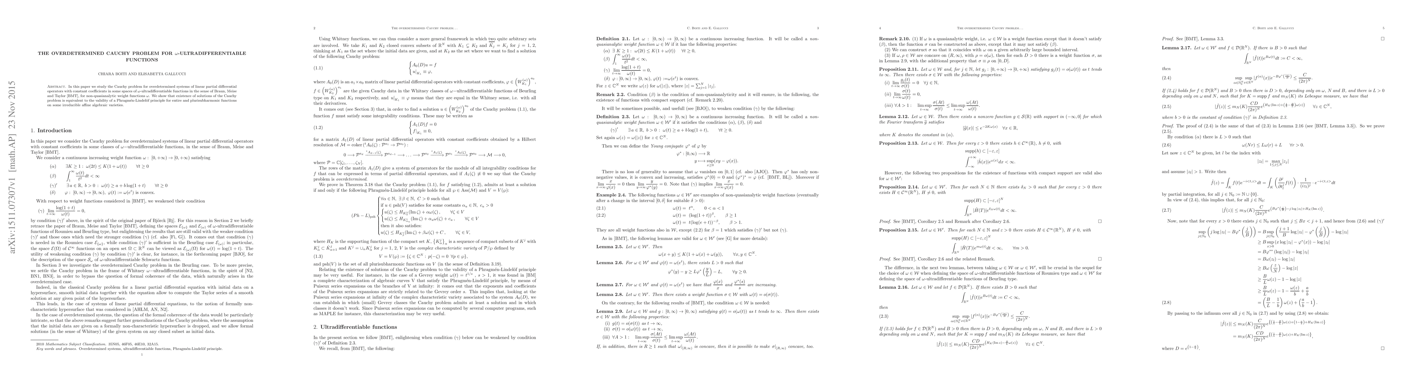 This paper investigates the Cauchy problem for overdetermined linear partial differential equations in the space of $\omega$-ultradifferentiable functions, proving that solutions exist if and only if a Phragmén-Lindelof principle holds for certain entire and plurisubharmonic functions on affine algebraic varieties.