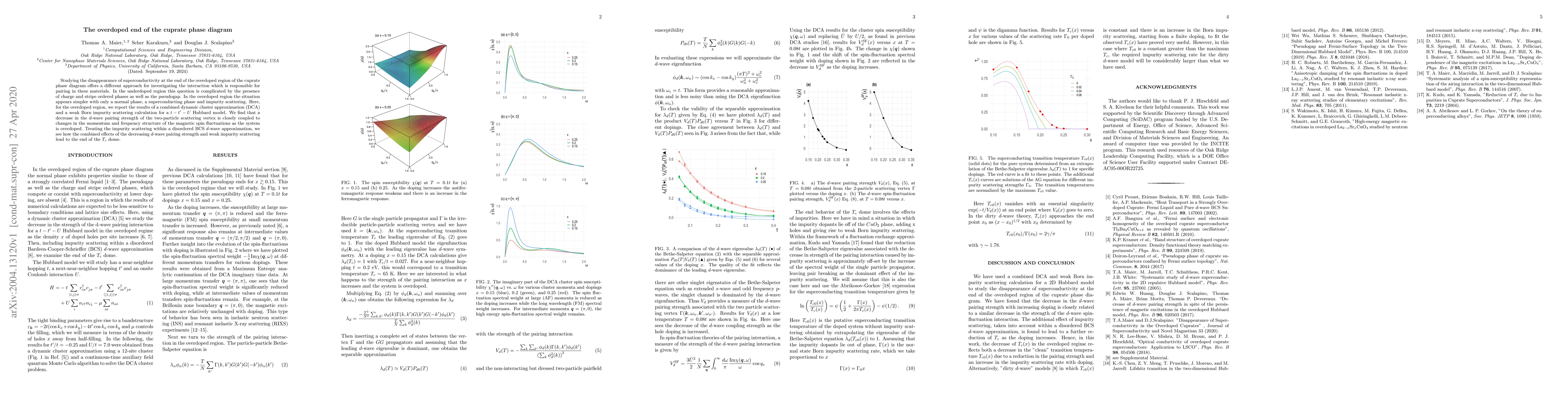 Studying the disappearance of superconductivity at the end of the overdoped region of the cuprate phase diagram offers a different approach for investigating the interaction which is responsible for pairing in these materials. In the underdoped region this question is complicated by the presence of charge and stripe ordered phases as well as the pseudogap. In the overdoped region the situation appears simpler with only a normal phase, a superconducting phase and impurity scattering. Here, for the overdoped region, we report the results of a combined dynamic cluster approximation (DCA) and a weak Born impurity scattering calculation for a $t-t'-U$ Hubbard model. We find that a decrease in the $d$-wave pairing strength of the two-particle scattering vertex is closely coupled to changes in the momentum and frequency structure of the magnetic spin fluctuations as the system is overdoped. Treating the impurity scattering within a disordered BCS $d$-wave approximation, we see how the combined effects of the decreasing $d$-wave pairing strength and weak impurity scattering lead to the end of the $T_c$ dome.