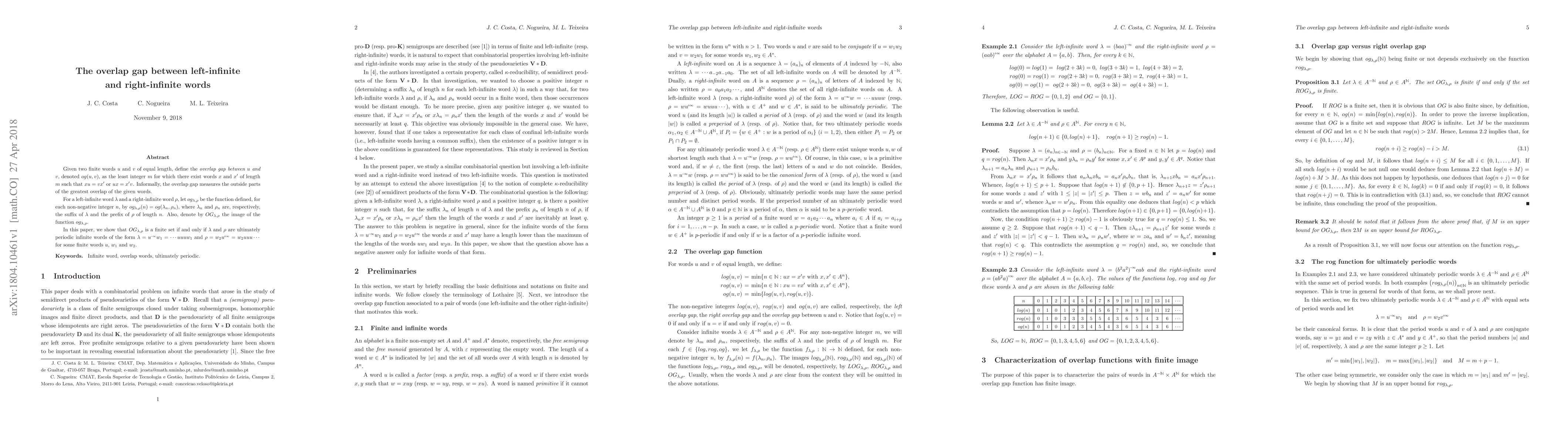Given two finite words $u$ and $v$ of equal length, define the \emph{overlap gap between $u$ and $v$}, denoted $og(u,v)$, as the least integer $m$ for which there exist words $x$ and $x'$ of length $m$ such that $xu=vx'$ or $ux=x'v$. Informally, the overlap gap measures the outside parts of the greatest overlap of the given words. For a left-infinite word $\lambda$ and a right-infinite word $\rho$, let $og_{\lambda,\rho}$ be the function defined, for each non-negative integer $n$, by $og_{\lambda,\rho}(n)=og(\lambda_n,\rho_n)$, where $\lambda_n$ and $\rho_n$ are, respectively, the suffix of $\lambda$ and the prefix of $\rho$ of length $n$. Also, denote by $OG_{\lambda,\rho}$ the image of the function $og_{\lambda,\rho}$. In this paper, we show that $OG_{\lambda,\rho}$ is a finite set if and only if $\lambda$ and $\rho$ are ultimately periodic infinite words of the form $\lambda=u^{-\infty}w_1=\cdots uuuw_1$ and $\rho=w_2u^\infty=w_2uuu\cdots$ for some finite words $u$, $w_1$ and $w_2$.
