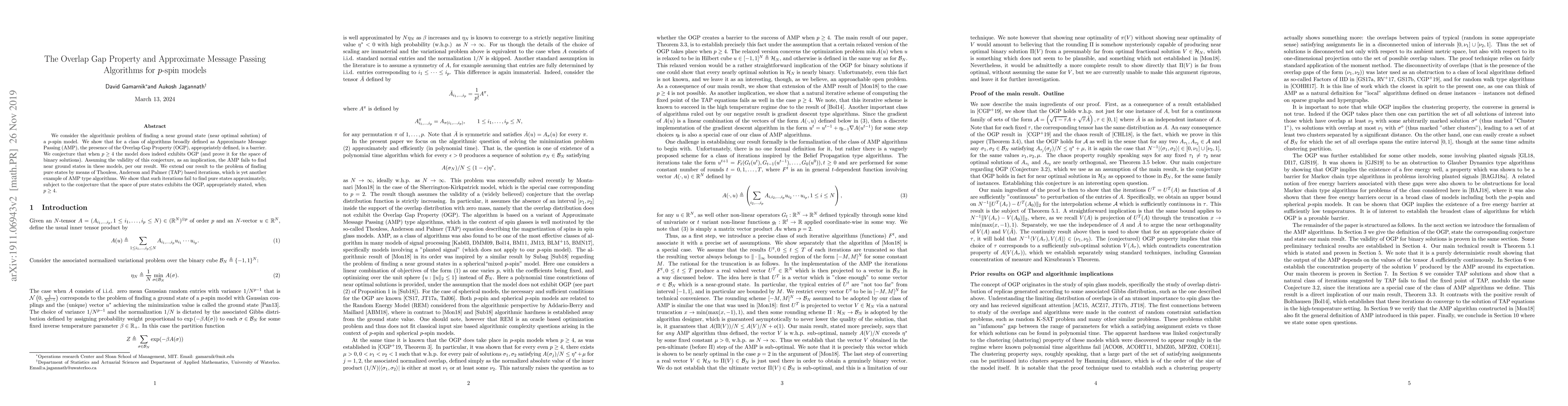 We consider the algorithmic problem of finding a near ground state (near optimal solution) of a $p$-spin model. We show that for a class of algorithms broadly defined as Approximate Message Passing (AMP), the presence of the Overlap Gap Property (OGP), appropriately defined, is a barrier. We conjecture that when $p\ge 4$ the model does indeed exhibits OGP (and prove it for the space of binary solutions). Assuming the validity of this conjecture, as an implication, the AMP fails to find near ground states in these models, per our result. We extend our result to the problem of finding pure states by means of Thouless, Anderson and Palmer (TAP) based iterations, which is yet another example of AMP type algorithms. We show that such iterations fail to find pure states approximately, subject to the conjecture that the space of pure states exhibits the OGP, appropriately stated, when $p\ge 4$.
