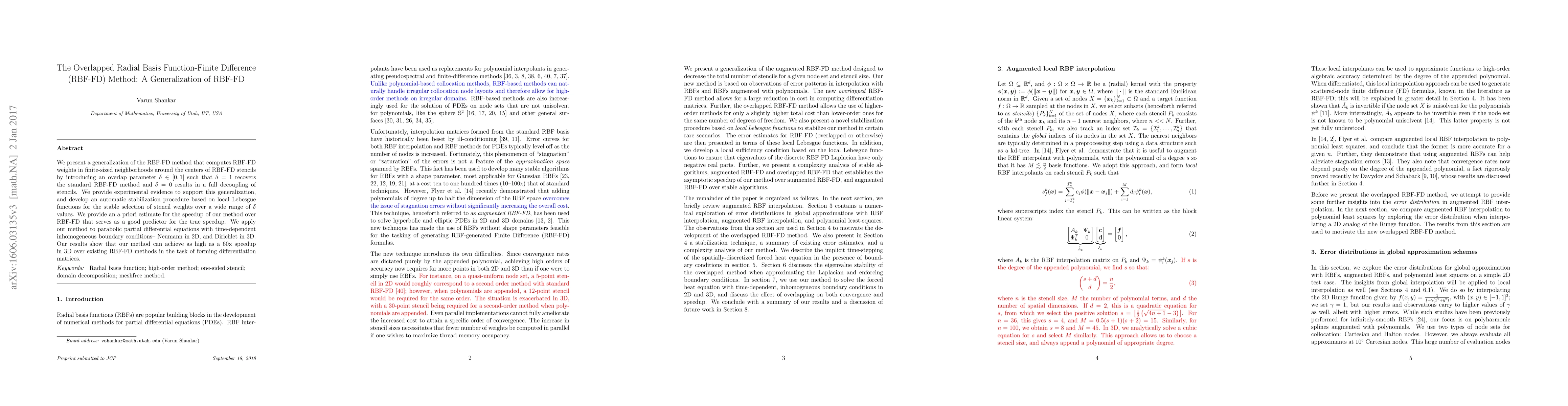The paper generalizes the RBF-FD method by introducing an overlap parameter to compute weights in finite-sized neighborhoods, achieving up to a 60x speedup over existing methods in forming differentiation matrices for solving parabolic PDEs. An automatic stabilization procedure is developed for optimal stencil weight selection.