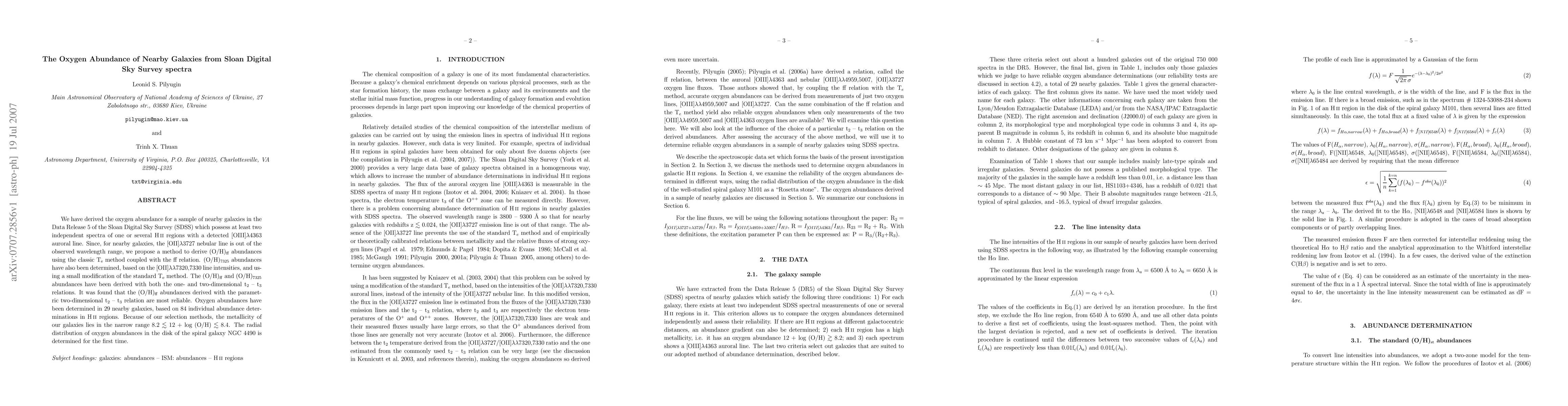 We have derived the oxygen abundance for a sample of nearby galaxies in the Data Release 5 of the Sloan Digital Sky Survey (SDSS) which possess at least two independent spectra of one or several HII regions with a detected [OIII]4363 auroral line. Since, for nearby galaxies, the [OII]3727 nebular line is out of the observed wavelength range, we propose a method to derive (O/H)_ff abundances using the classic Te method coupled with the ff relation. (O/H)_7325 abundances have also been determined, based on the [OII]7320,7330 line intensities, and using a small modification of the standard Te method. The (O/H)_ff and (O/H)_7325 abundances have been derived with both the one- and two-dimensional t_2 - t_3 relations. It was found that the (O/H)_ff abundances derived with the parametric two-dimensional t_2 - t_3 relation are most reliable. Oxygen abundances have been determined in 29 nearby galaxies, based on 84 individual abundance determinations in HII regions. Because of our selection methods, the metallicity of our galaxies lies in the narrow range 8.2 < 12 + log (O/H) < 8.4. The radial distribution of oxygen abundances in the disk of the spiral galaxy NGC 4490 is determined for the first time.