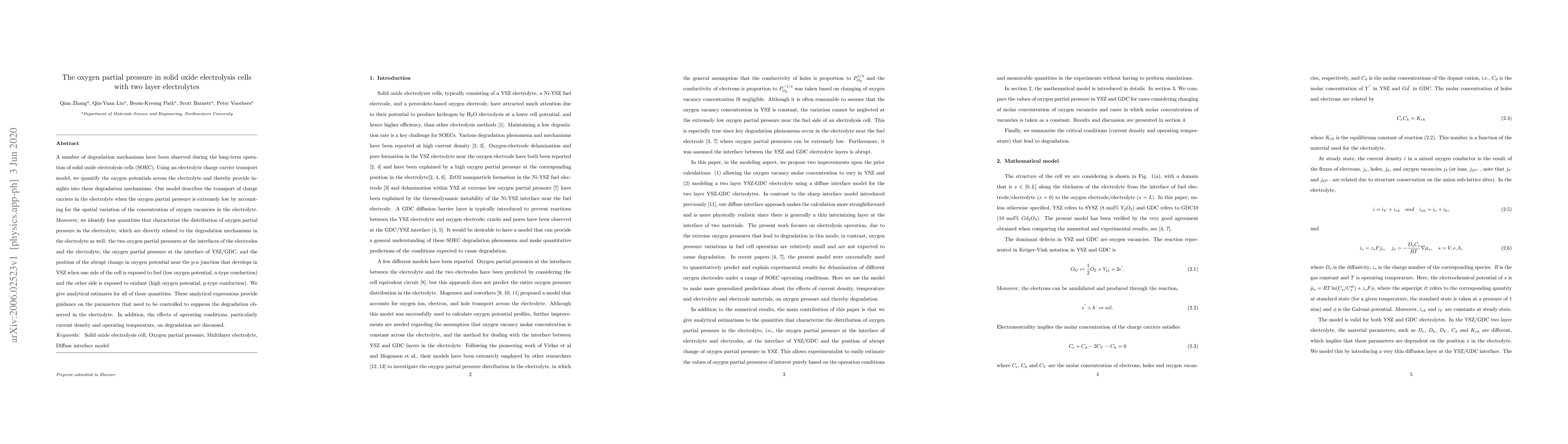 A number of degradation mechanisms have been observed during the long-term operation of solid oxide electrolysis cells (SOEC). Using an electrolyte charge carrier transport model, we quantify the oxygen potentials across the electrolyte and thereby provide insights into these degradation mechanisms. Our model describes the transport of charge carriers in the electrolyte when the oxygen partial pressure is extremely low by accounting for the spatial variation of the concentration of oxygen vacancies in the electrolyte. Moreover, we identify four quantities that characterize the distribution of oxygen partial pressure in the electrolyte, which are directly related to the degradation mechanisms in the electrolyte as well: the two oxygen partial pressures at the interfaces of the electrodes and the electrolyte, the oxygen partial pressure at the interface of YSZ/GDC, and the position of the abrupt change in oxygen potential near the p-n junction that develops in YSZ when one side of the cell is exposed to fuel (low oxygen potential, n-type conduction) and the other side is exposed to oxidant (high oxygen potential, p-type conduction). We give analytical estimates for all of these quantities. These analytical expressions provide guidance on the parameters that need to be controlled to suppress the degradation observed in the electrolyte. In addition, the effects of operating conditions, particularly current density and operating temperature, on degradation are discussed.
