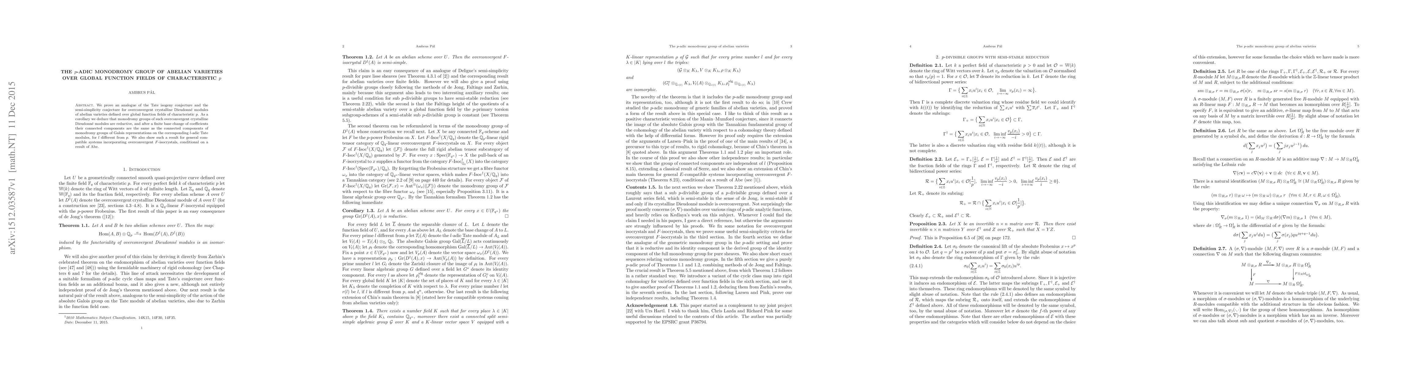 This paper establishes an analogue of the Tate isogeny and semi-simplicity conjectures for abelian varieties over global function fields of characteristic $p$, demonstrating that their $p$-adic monodromy groups are reductive and align with those of $l$-adic Galois representations for $l\neq p$ after a finite base change. The findings also extend to compatible systems of overconvergent $F$-isocrystals, pending a result from Abe.