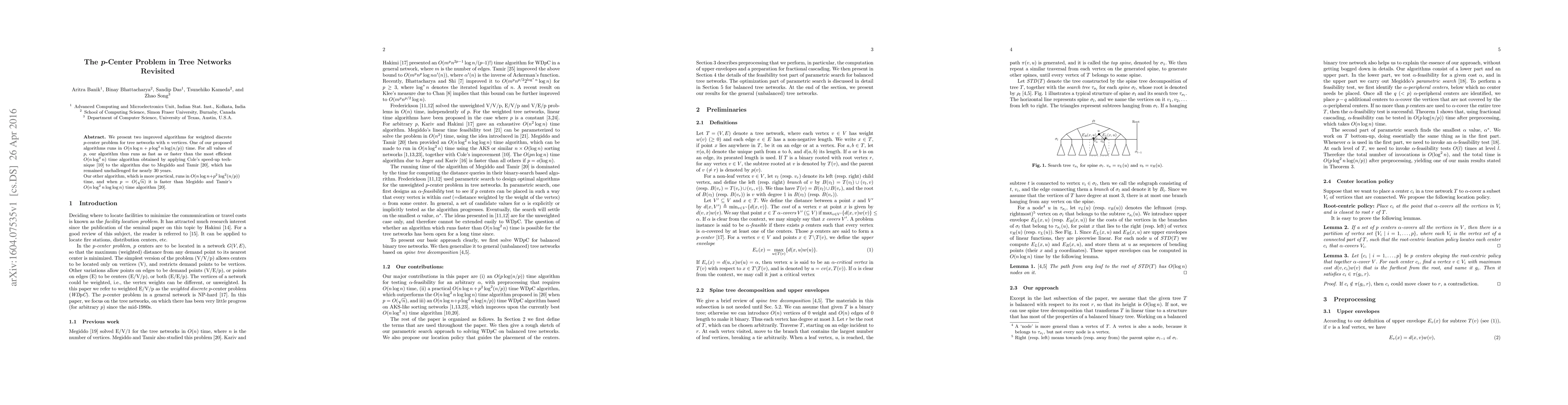 Researchers have developed two improved algorithms for solving the $p$-center problem in tree networks, achieving faster time complexities than existing methods, with one algorithm running in $O(n ext{ log } n + p ext{ log}^2 n ext{ log}(n/p))$ time.