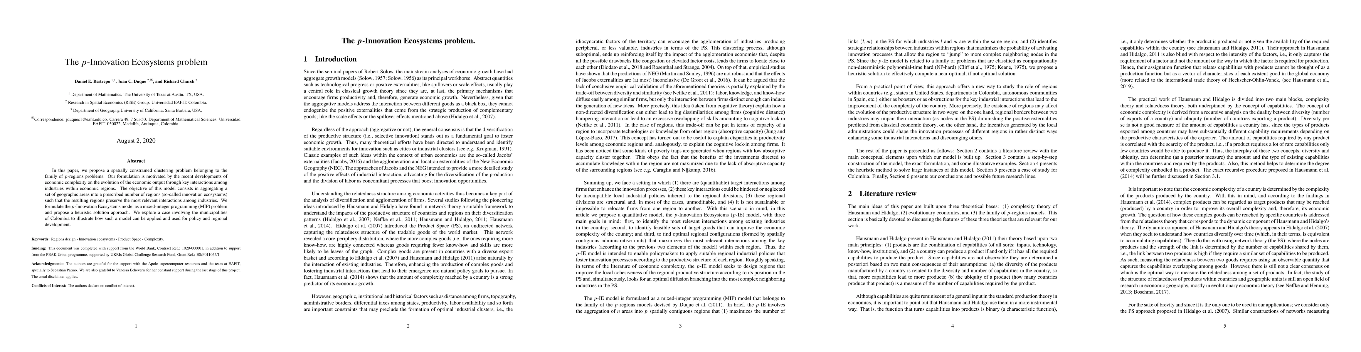In this paper, we propose a spatially constrained clustering problem belonging to the family of "p-regions" problems. Our formulation is motivated by the recent developments of economic complexity on the evolution of the economic output through key interactions among industries within economic regions. The objective of this model consists in aggregating a set of geographic areas into a prescribed number of regions (so-called innovation ecosystems) such that the resulting regions preserve the most relevant interactions among industries. We formulate the p-Innovation Ecosystems model as a mixed-integer programming (MIP) problem and propose a heuristic solution approach. We explore a case involving the municipalities of Colombia to illustrate how such a model can be applied and used for policy and regional development.