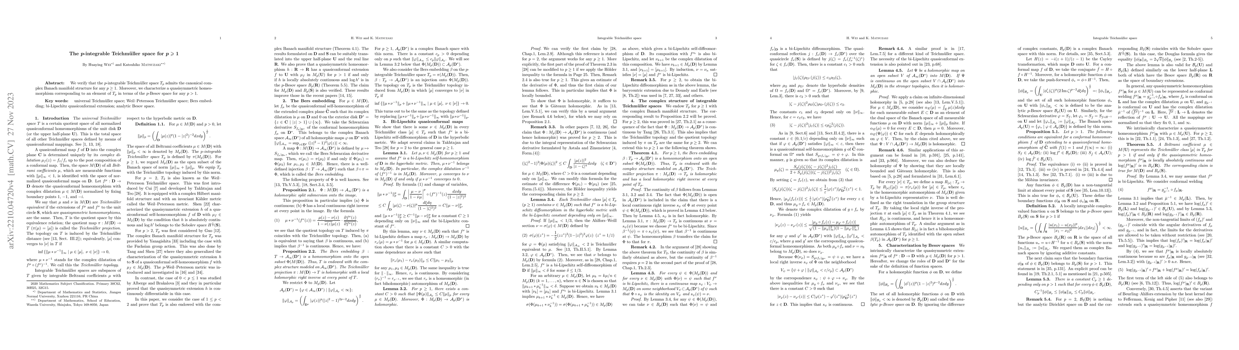 This paper confirms that the $p$-integrable Teichmüller space $T_p$ possesses a canonical complex Banach manifold structure for $p \geq 1$. It also characterizes quasisymmetric homeomorphisms in $T_p$ using $p$-Besov space for $p > 1$.