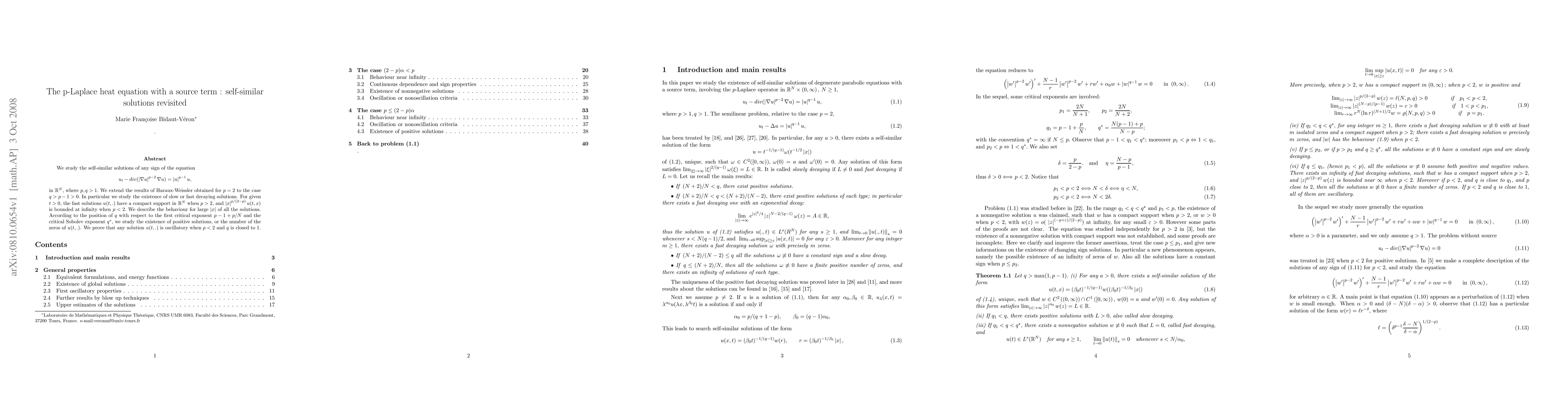 We study the self-similar solutions of any sign of the equation u_{t}-div(|∇u|^{p-2}∇u)=|u|^{q-1}u, in R^{N}, where p,q>1. We extend the results of Haraux-Weissler obtained for p=2 to the case q>p-1>0. In particular we study the existence of slow or fast decaying solutions. For given t>0, the fast solutions u(t,.) have a compact support in R^{N} when p>2, and |x|^{p/(2-p)}u(t,x) is bounded at infinity when p<2. We describe the behaviour for large |x| of all the solutions. According to the position of q with respect to the first critical exponent p-1+p/N and the critical Sobolev exponent q^{∗}, we study the existence of positive solutions, or the number of the zeros of u(t,.). We prove that any solution u(t,.) is oscillatory when p<2 and q is closed to 1.