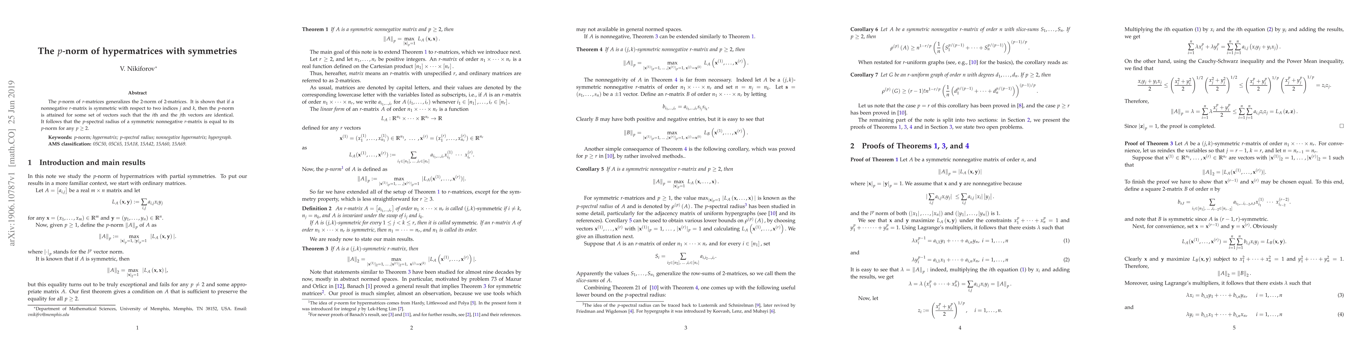Summary: This paper investigates the $p$-norm of symmetric nonnegative hypermatrices, demonstrating that when a hypermatrix is symmetric with respect to two indices, its $p$-norm is achieved by identical vectors. Consequently, the $p$-spectral radius equals the $p$-norm for any $p\geq2$.
