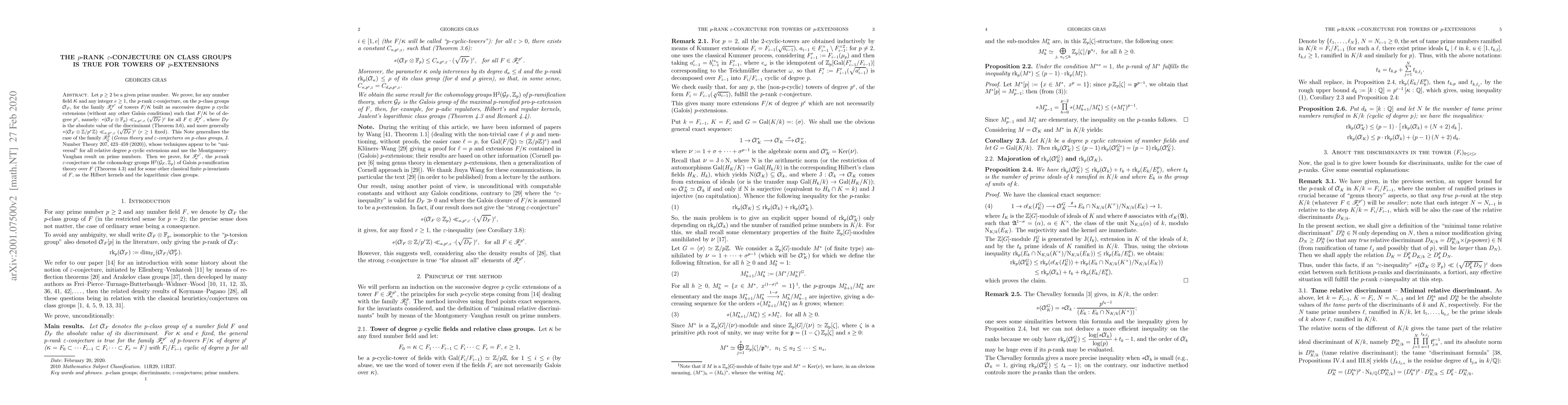 This paper proves the p-rank $\epsilon$-conjecture for towers of p-extensions in number fields, showing that the p-primary part of the p-class group of such fields is bounded by a function of the field discriminant raised to a power, generalizing previous results for rational fields. The proof also extends to p-ramification cohomology groups and other classical p-invariants.
