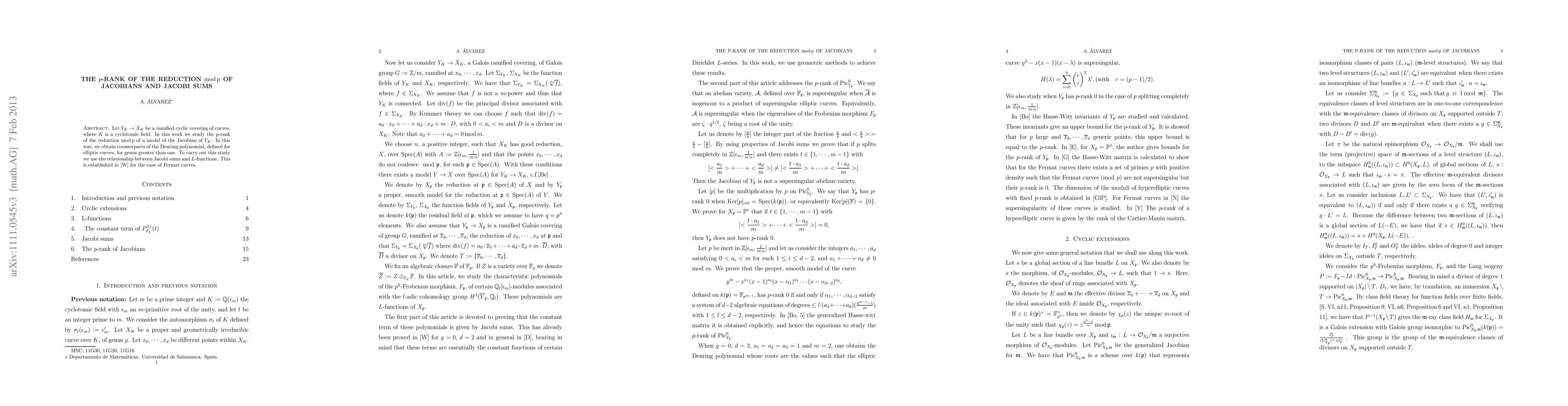 Let $Y_K\to X_K$ be a ramified cyclic covering of curves, where $K$ is a cyclotomic field. In this work we study the $p$-rank of the reduction $\rm{mod}\, p$ of a model of the jacobian of $Y_K$. In this way, we obtain counterparts of the Deuring polynomial, defined for elliptic curves, for genus greater than one. Moreover, we show that curves $Y_K$ give Hecke characters for cyclotomic fields. To carry out this study we use Jacobi sums and certain $L$-functions.
