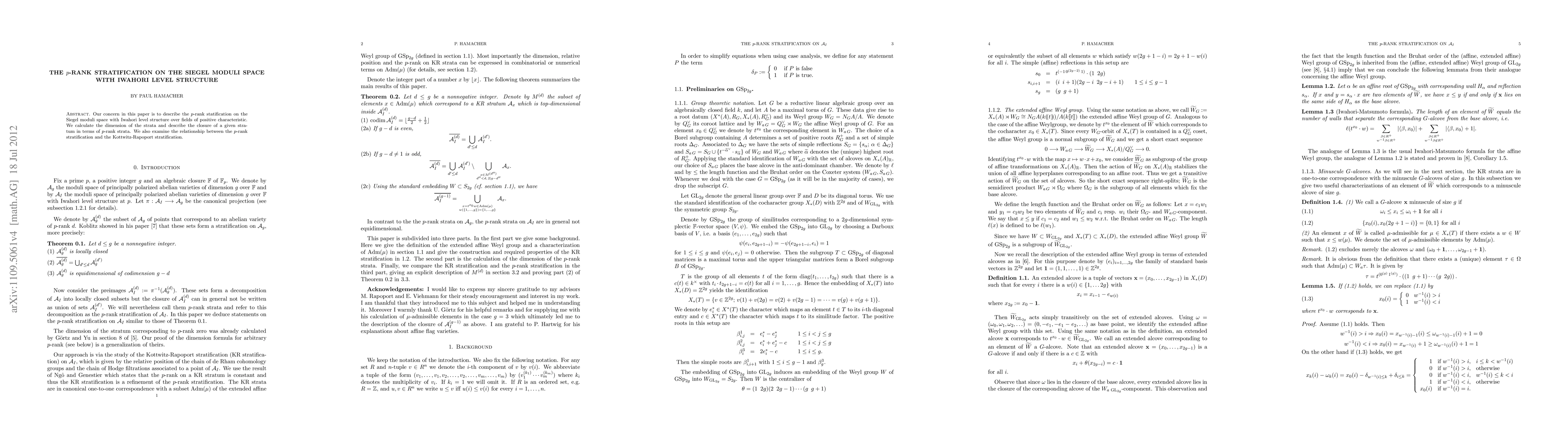 This paper investigates the p-rank stratification on the Siegel moduli space with Iwahori level structure in positive characteristic fields, calculating stratum dimensions and describing their closures. It also explores the relationship between the p-rank and Kottwitz-Rapoport stratifications.