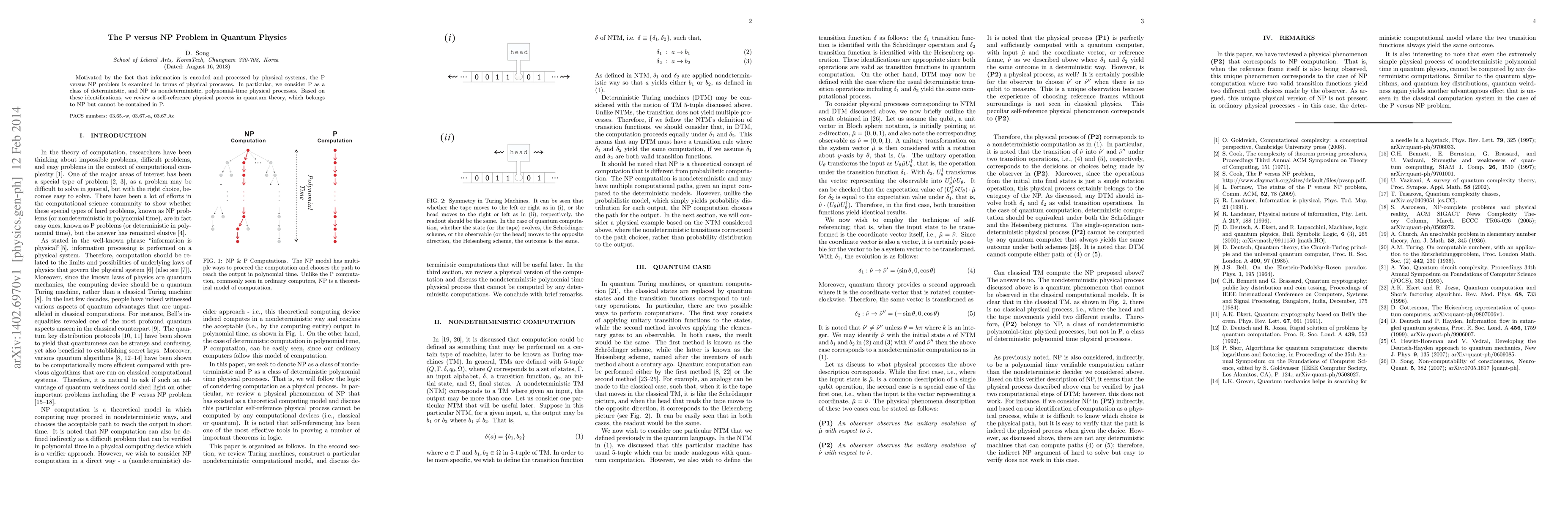 The paper investigates the P versus NP problem through the lens of physical processes, identifying P with deterministic and NP with nondeterministic polynomial-time processes. It highlights a self-referential quantum process that exemplifies an NP problem not contained within P.