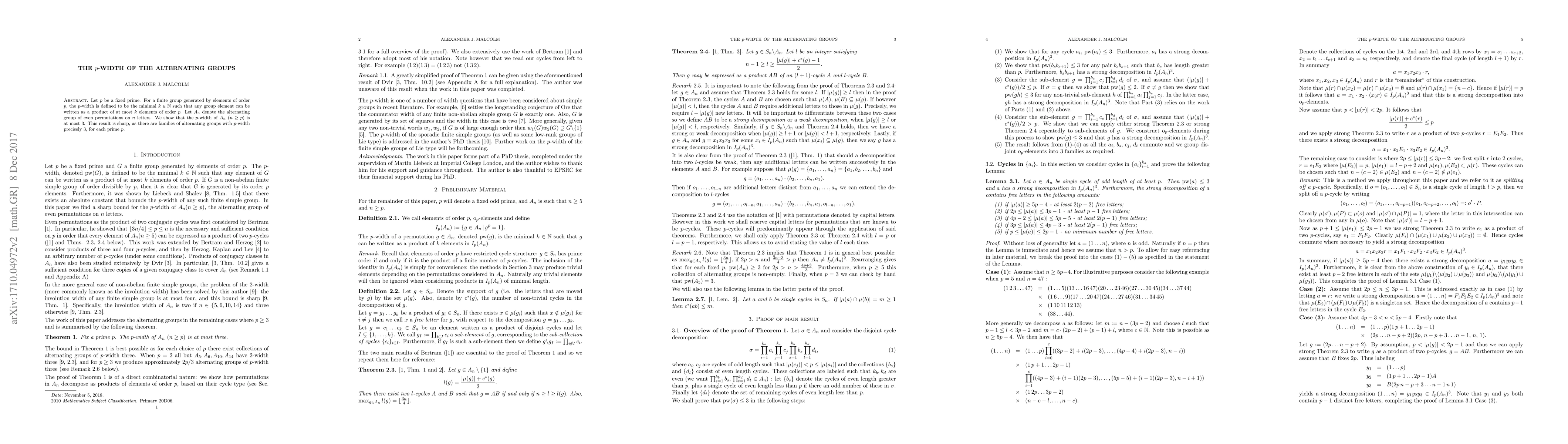 Let $p$ be a fixed prime. For a finite group generated by elements of order $p$, the $p$-width is defined to be the minimal $k\in\mathbb{N}$ such that any group element can be written as a product of at most $k$ elements of order $p$. Let $A_{n}$ denote the alternating group of even permutations on $n$ letters. We show that the $p$-width of $A_{n}$ $(n\geq p)$ is at most $3$. This result is sharp, as there are families of alternating groups with $p$-width precisely 3, for each prime $p$.