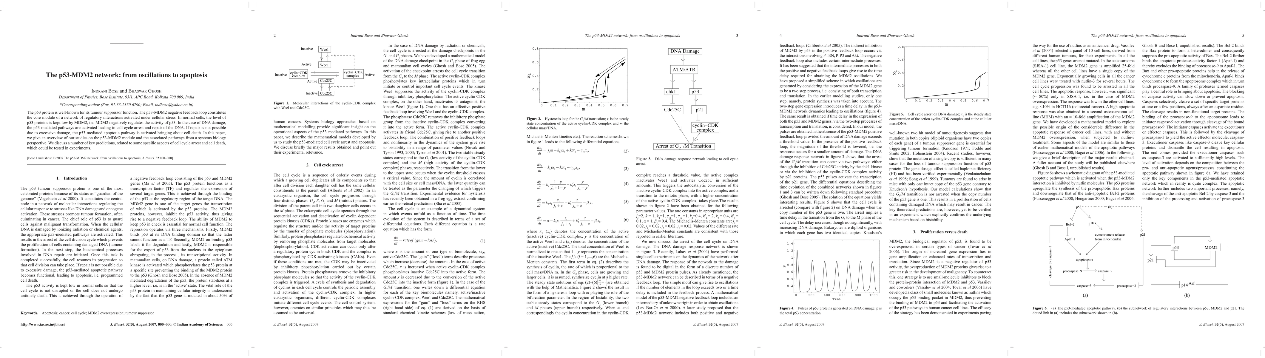 This paper explores the regulatory interactions within the p53-MDM2 network, focusing on how it maintains cellular stability and initiates apoptosis in response to DNA damage. The authors present a systems biology perspective, highlighting potential experimental targets for further study on cell cycle arrest and apoptosis.