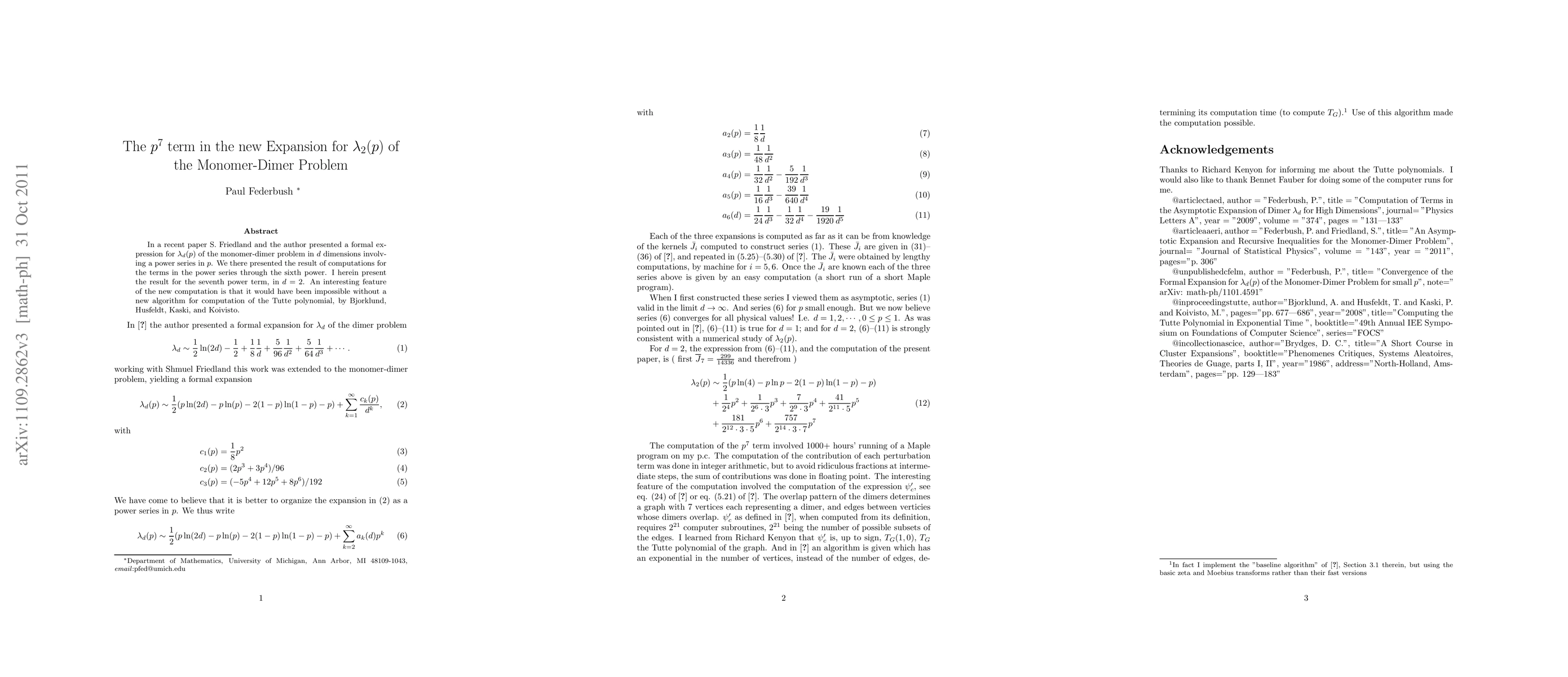 In a recent paper S. Friedland and the author presented a formal expression for Lambda_d(p) of the monomer-dimer problem in d dimensions involving a power series in p. We there presented the result of computations for the terms in the power series through the sixth power. I herein present the result for the seventh power term, in d = 2. An interesting feature of the new computation is that it would have been impossible without a new algorithm for computation of the Tutte polynomial, by Bjorklund, Husfeldt, Kaski, and Koivisto.