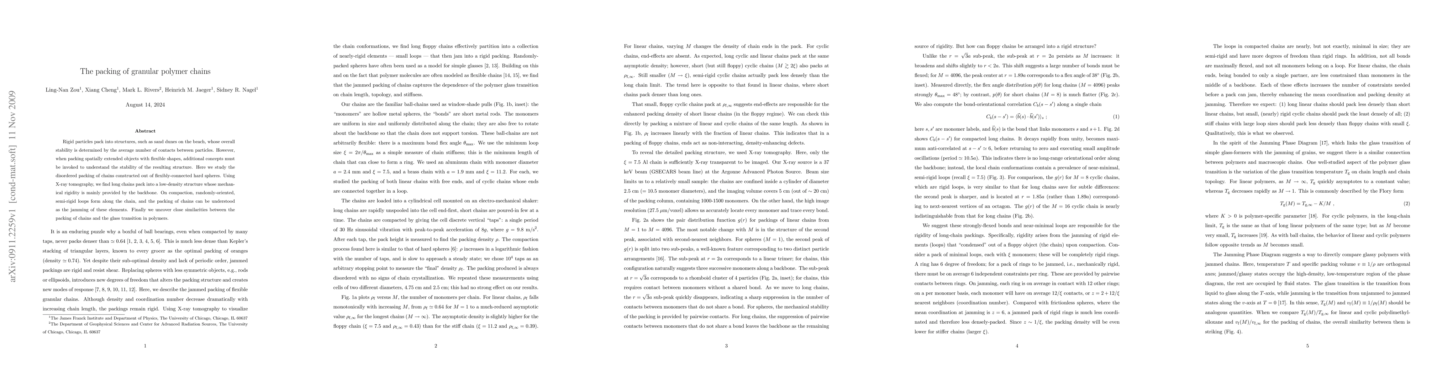 Rigid particles pack into structures, such as sand dunes on the beach, whose overall stability is determined by the average number of contacts between particles. However, when packing spatially extended objects with flexible shapes, additional concepts must be invoked to understand the stability of the resulting structure. Here we study the disordered packing of chains constructed out of flexibly-connected hard spheres. Using X-ray tomography, we find long chains pack into a low-density structure whose mechanical rigidity is mainly provided by the backbone. On compaction, randomly-oriented, semi-rigid loops form along the chain, and the packing of chains can be understood as the jamming of these elements. Finally we uncover close similarities between the packing of chains and the glass transition in polymers.