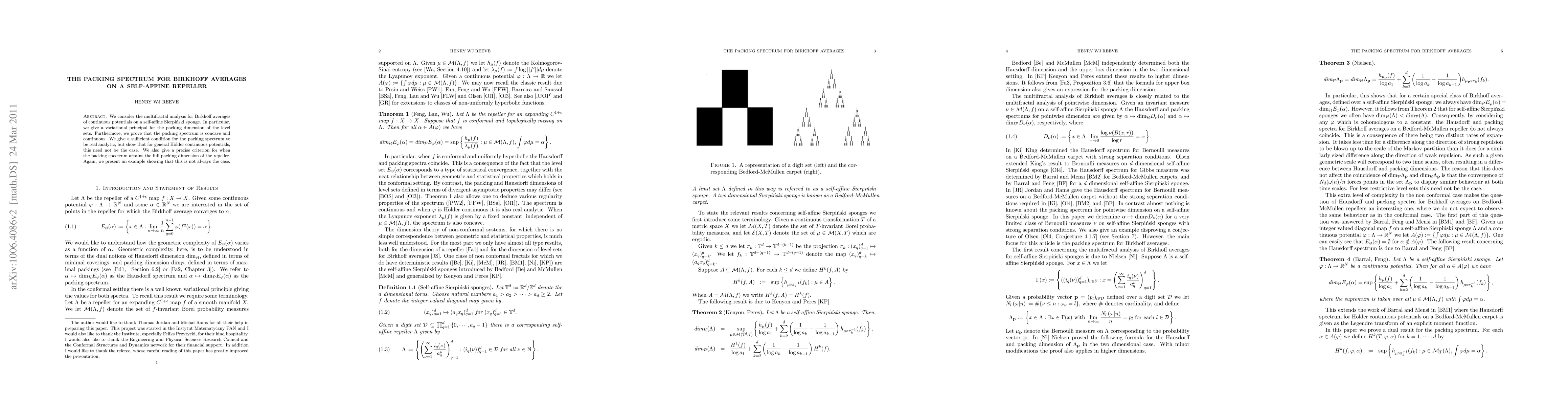 This paper conducts a multifractal analysis of Birkhoff averages on a self-affine Sierpiński sponge, providing a variational principle for the packing dimension of level sets. It proves the concavity and continuity of the packing spectrum, and discusses conditions for its real analyticity, noting exceptions for general Hölder continuous potentials.