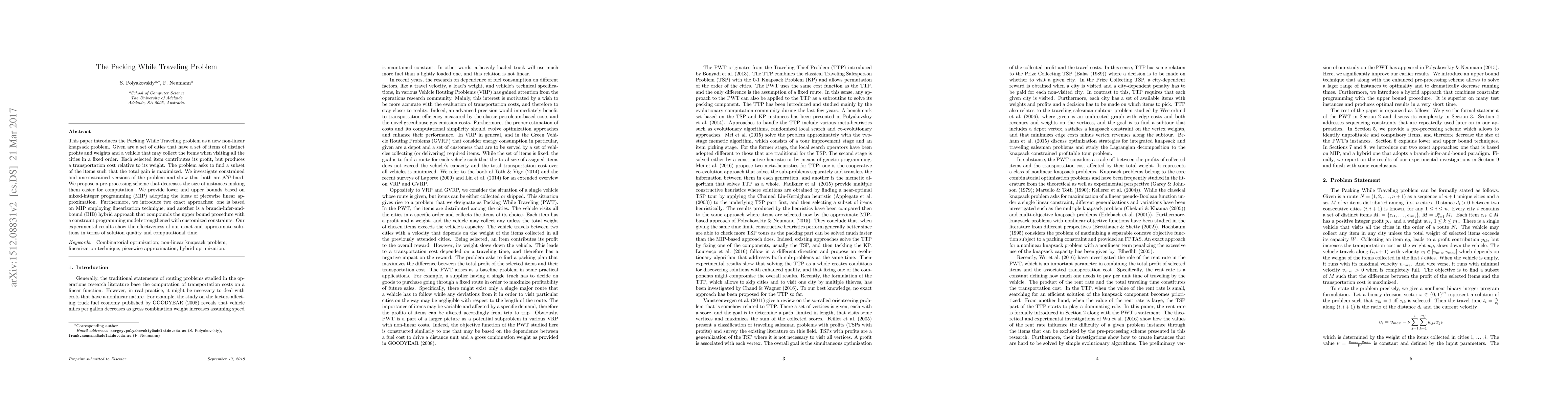 A new problem called Packing While Traveling is introduced as a non-linear knapsack problem where items have distinct profits and weights, and a vehicle collects them at specific cities. The paper proposes solutions to maximize profit while considering transportation costs.