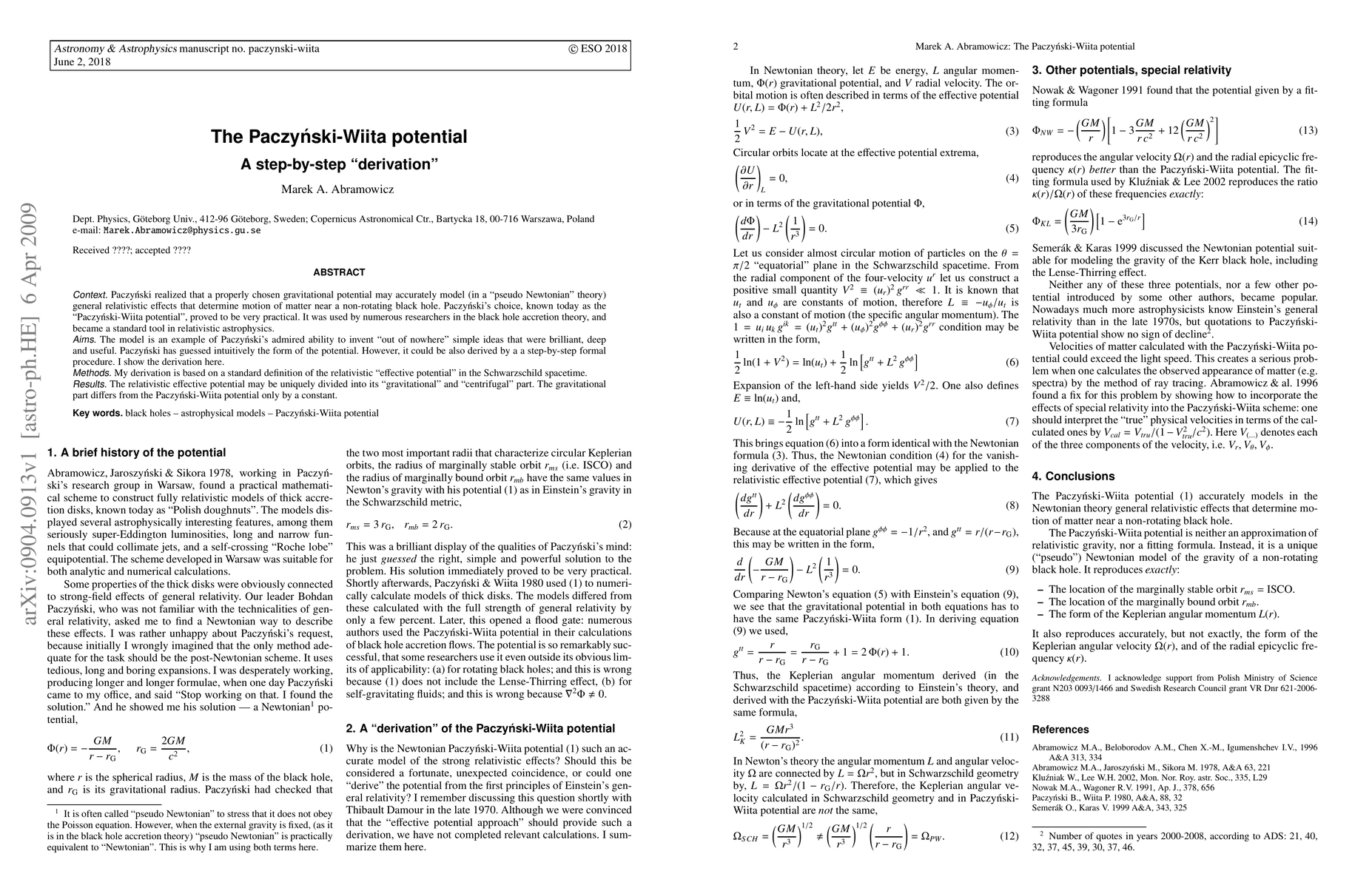 Paczynski realized that a properly chosen gravitational potential may accurately model (in a "pseudo Newtonian" theory) general relativistic effects that determine motion of matter near a non-rotating black hole. Paczynski's choice, known today as the "Paczynski-Wiita potential", proved to be very practical. It was used by numerous researchers in the black hole accretion theory, and became a standard tool in relativistic astrophysics. The model is an example of Paczynski's admired ability to invent "out of nowhere" simple ideas that were brilliant, deep and useful. Paczynski has guessed intuitively the form of the potential. However, it could be also derived by a a step-by-step formal procedure. I show the derivation here. My derivation is based on a standard definition of the relativistic "effective potential" in the Schwarzschild spacetime. The relativistic effective potential may be uniquely divided into its "gravitational" and "centrifugal" part. The gravitational part differs from the Paczynski-Wiita potential only by a constant.