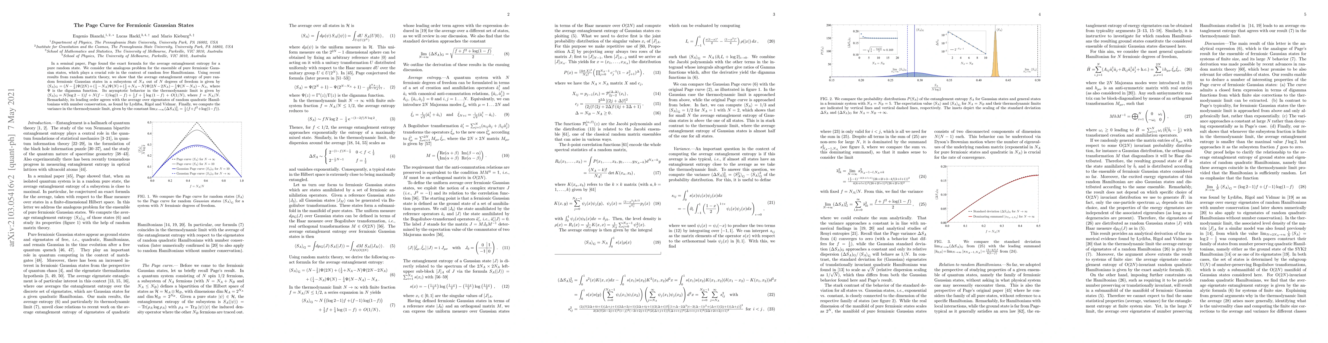 This paper derives the exact formula for the average entanglement entropy of pure fermionic Gaussian states, analogous to Page's result for random states. It shows that the leading order behavior matches that found for random quadratic Hamiltonians, and computes the variance in the thermodynamic limit.